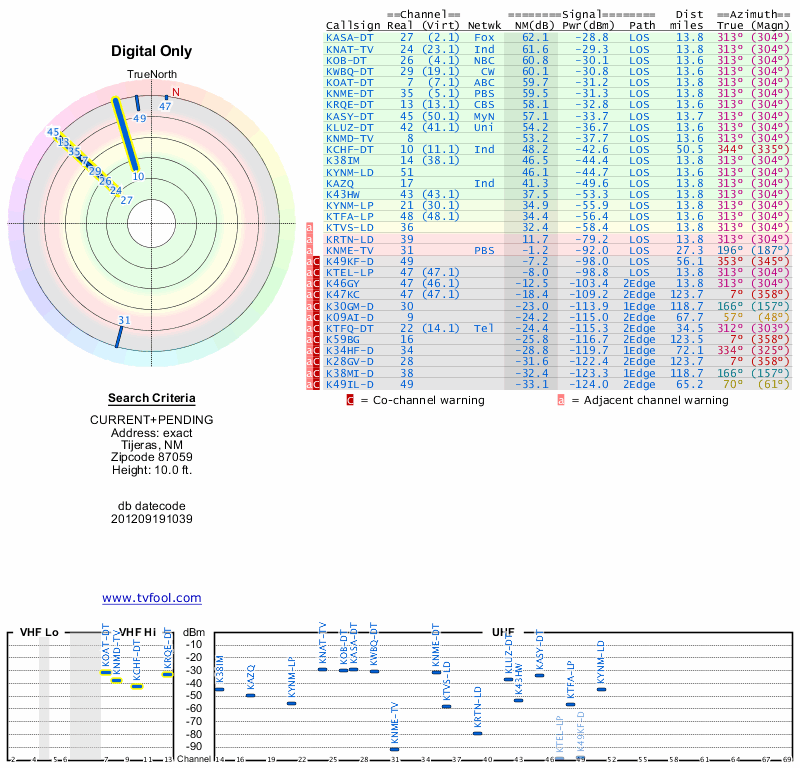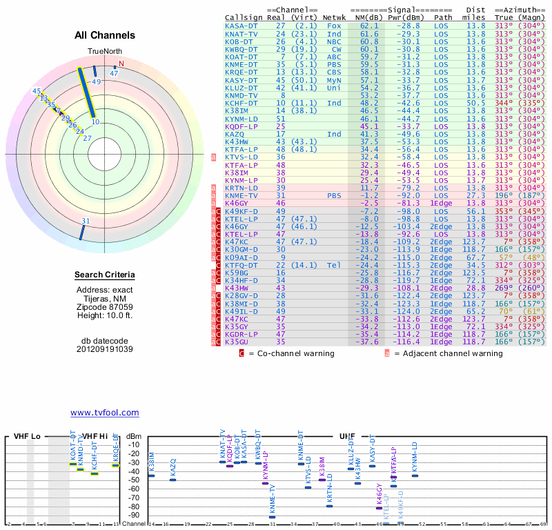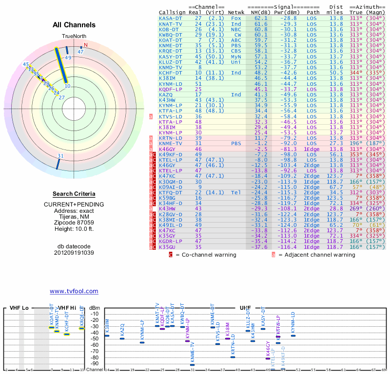 Here are the results for your location. The transmitter database was last updated on June 7, 2013. For more information about these plots and how to interpret them, please check out the Signal Analysis FAQ.
