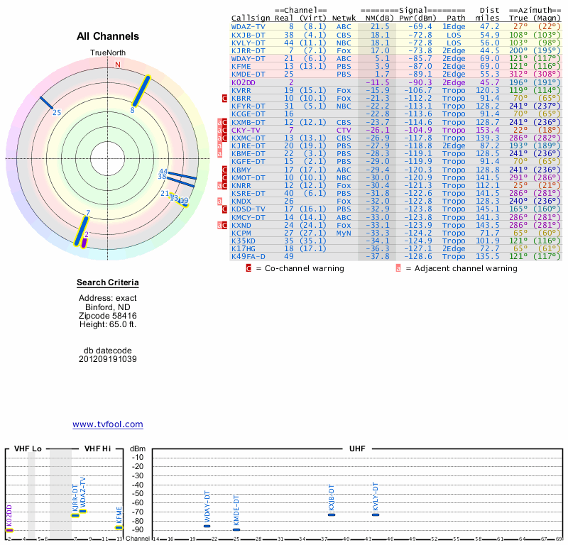 Here are the results for your location. The transmitter database was last updated on June 7, 2013. For more information about these plots and how to interpret them, please check out the Signal Analysis FAQ.