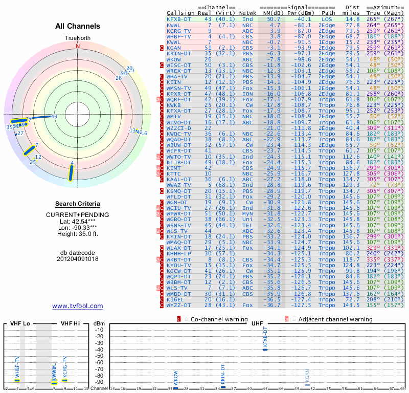 Here are the results for your location. The transmitter database was last updated on June 7, 2013. For more information about these plots and how to interpret them, please check out the Signal Analysis FAQ.