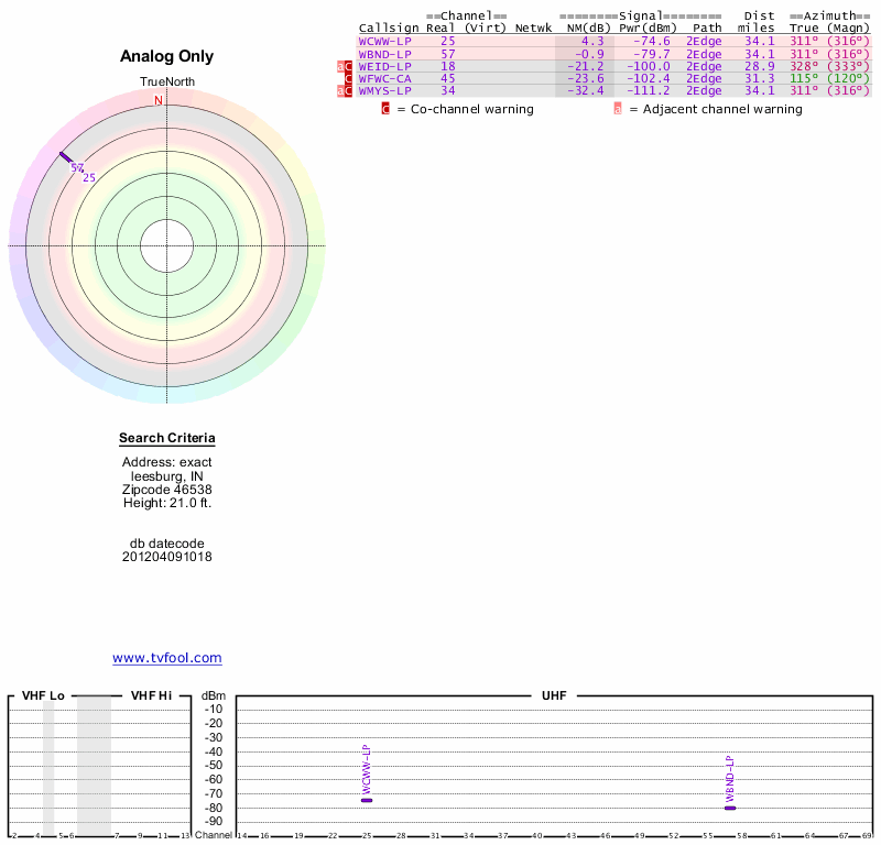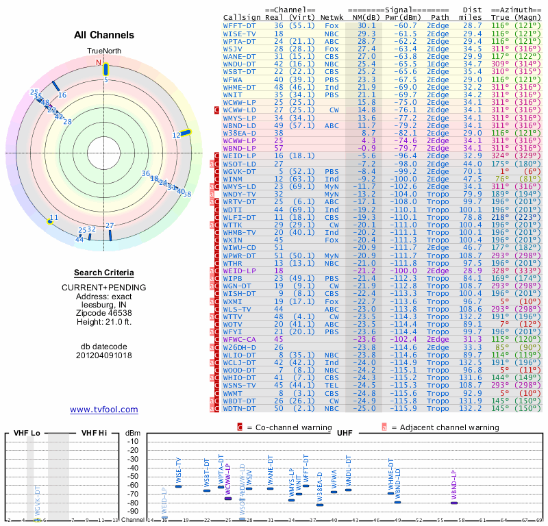 Here are the results for your location. The transmitter database was last updated on June 7, 2013. For more information about these plots and how to interpret them, please check out the Signal Analysis FAQ.