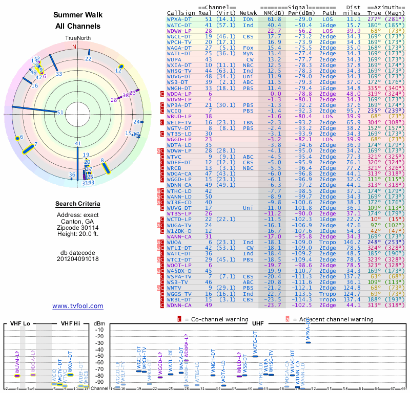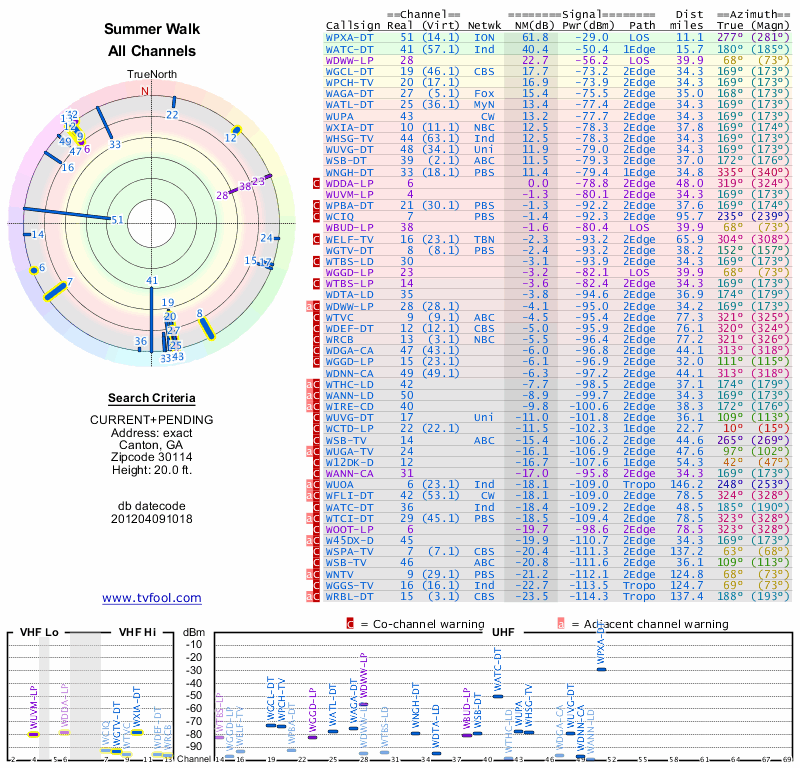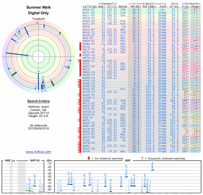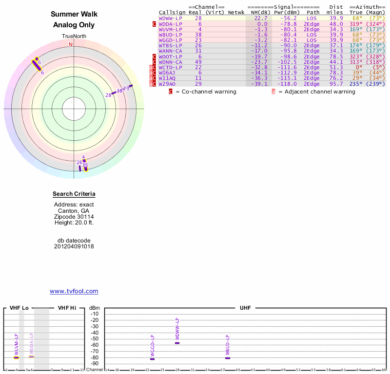 Here are the results for your location. The transmitter database was last updated on June 7, 2013. For more information about these plots and how to interpret them, please check out the Signal Analysis FAQ.