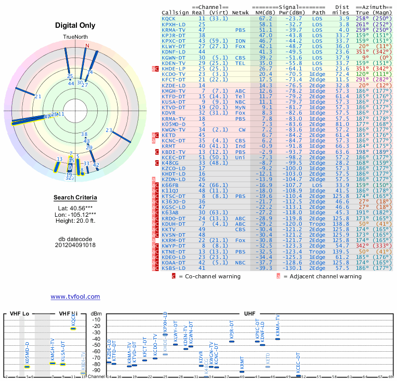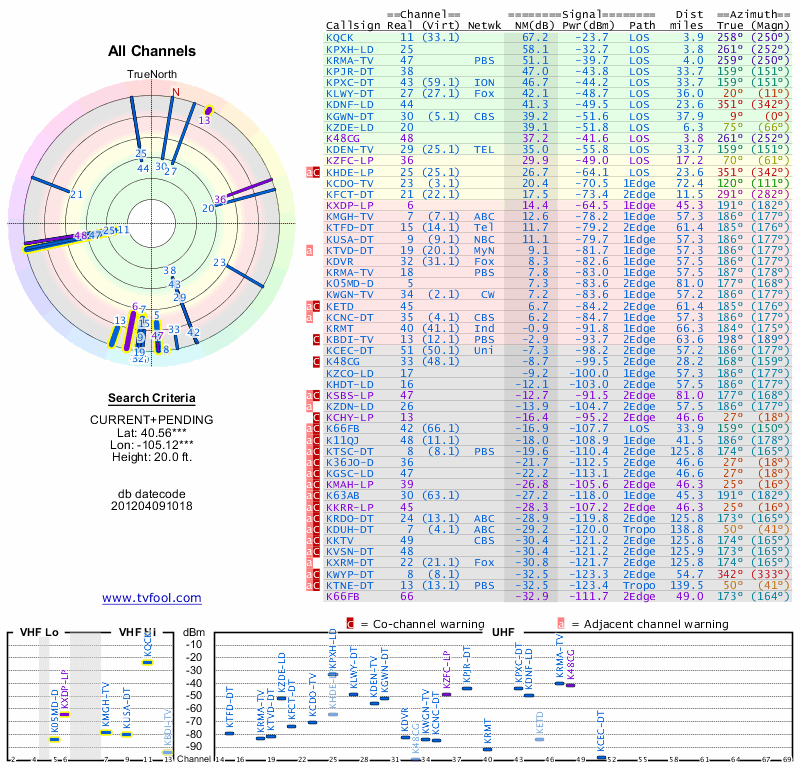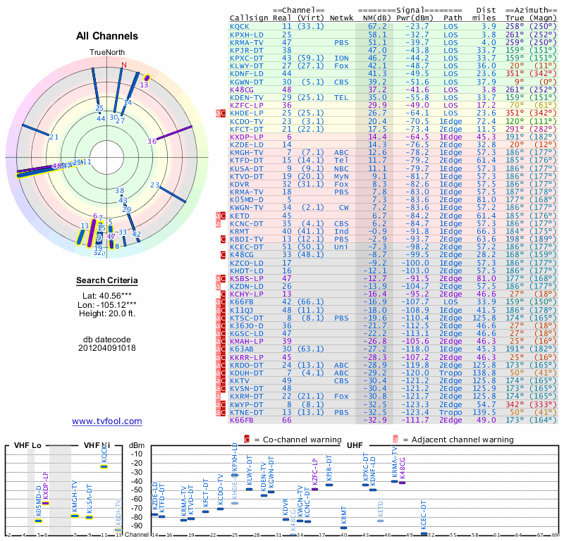 Here are the results for your location. The transmitter database was last updated on June 7, 2013. For more information about these plots and how to interpret them, please check out the Signal Analysis FAQ.