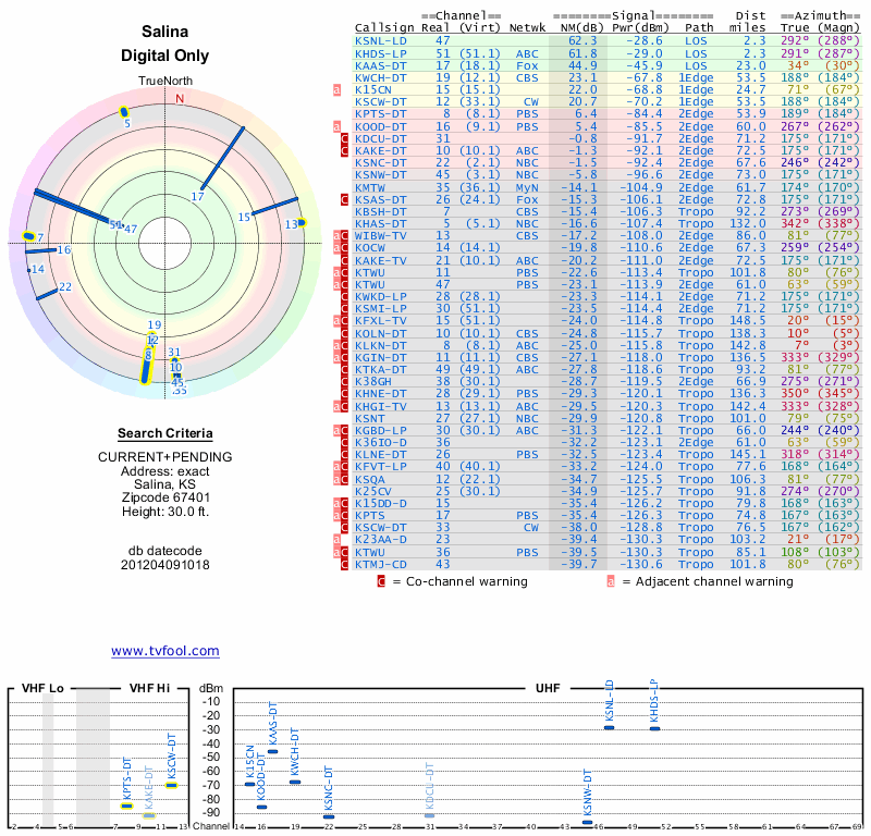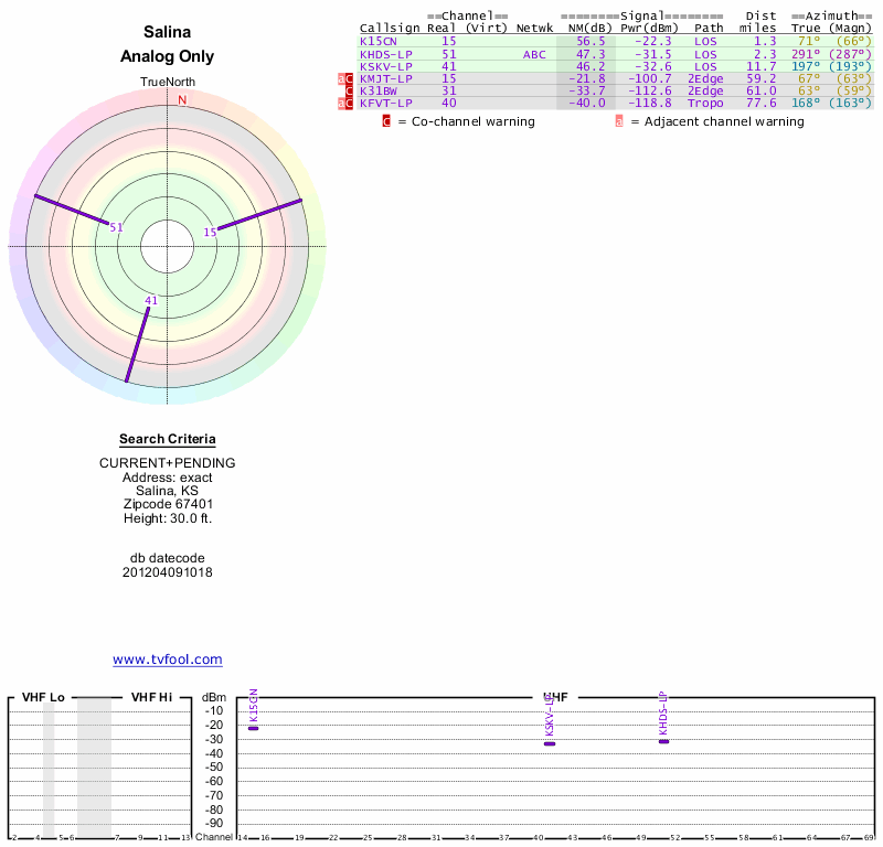 Here are the results for your location. The transmitter database was last updated on June 7, 2013. For more information about these plots and how to interpret them, please check out the Signal Analysis FAQ.