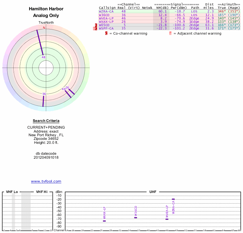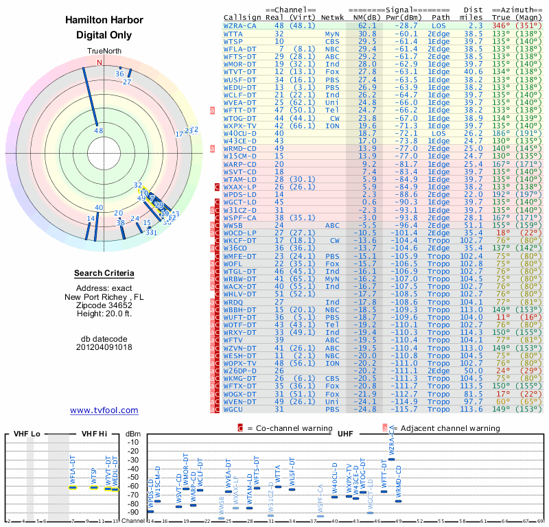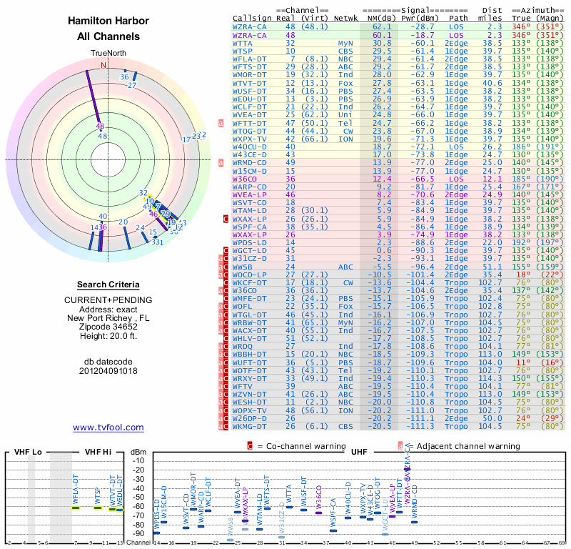 Here are the results for your location. The transmitter database was last updated on June 7, 2013. For more information about these plots and how to interpret them, please check out the Signal Analysis FAQ.