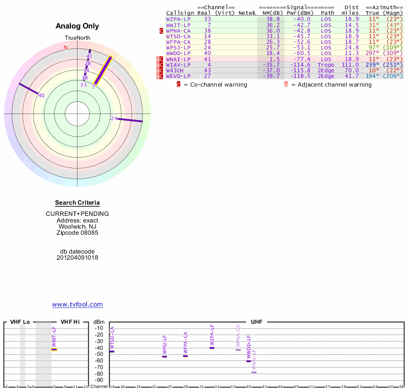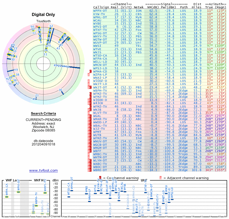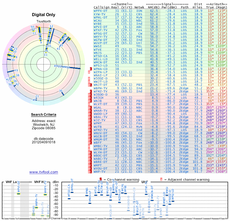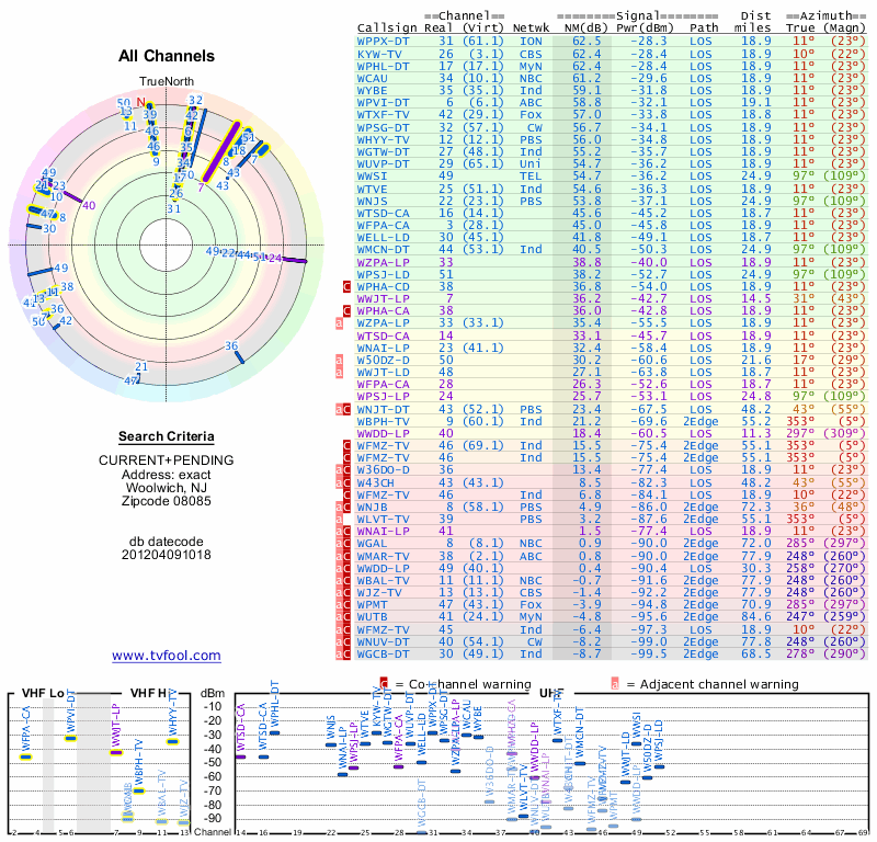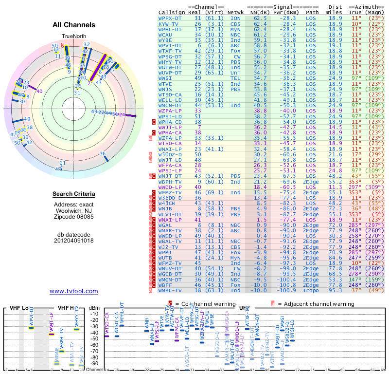 Here are the results for your location. The transmitter database was last updated on June 7, 2013. For more information about these plots and how to interpret them, please check out the Signal Analysis FAQ.