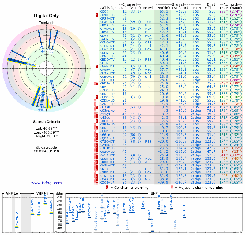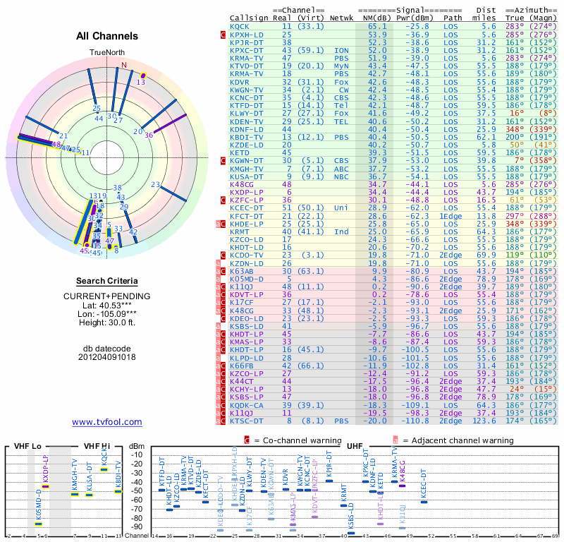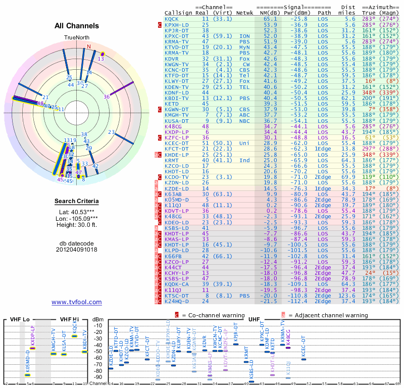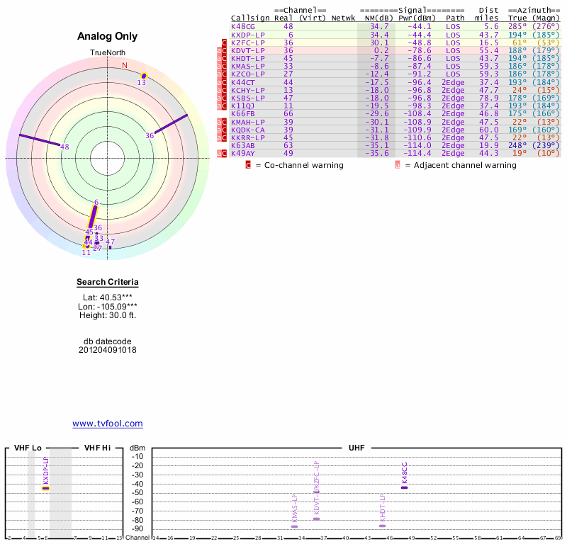 Here are the results for your location. The transmitter database was last updated on June 7, 2013. For more information about these plots and how to interpret them, please check out the Signal Analysis FAQ.