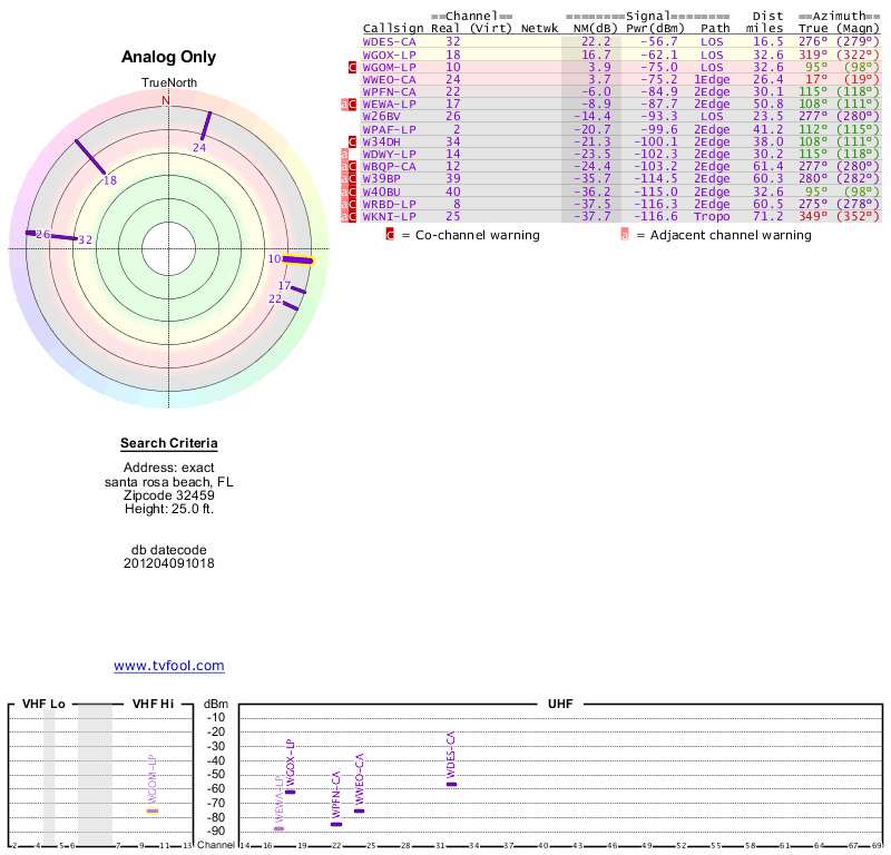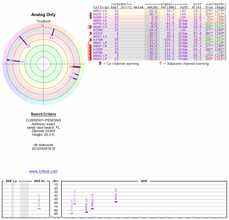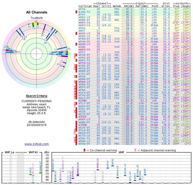 Here are the results for your location. The transmitter database was last updated on June 7, 2013. For more information about these plots and how to interpret them, please check out the Signal Analysis FAQ.