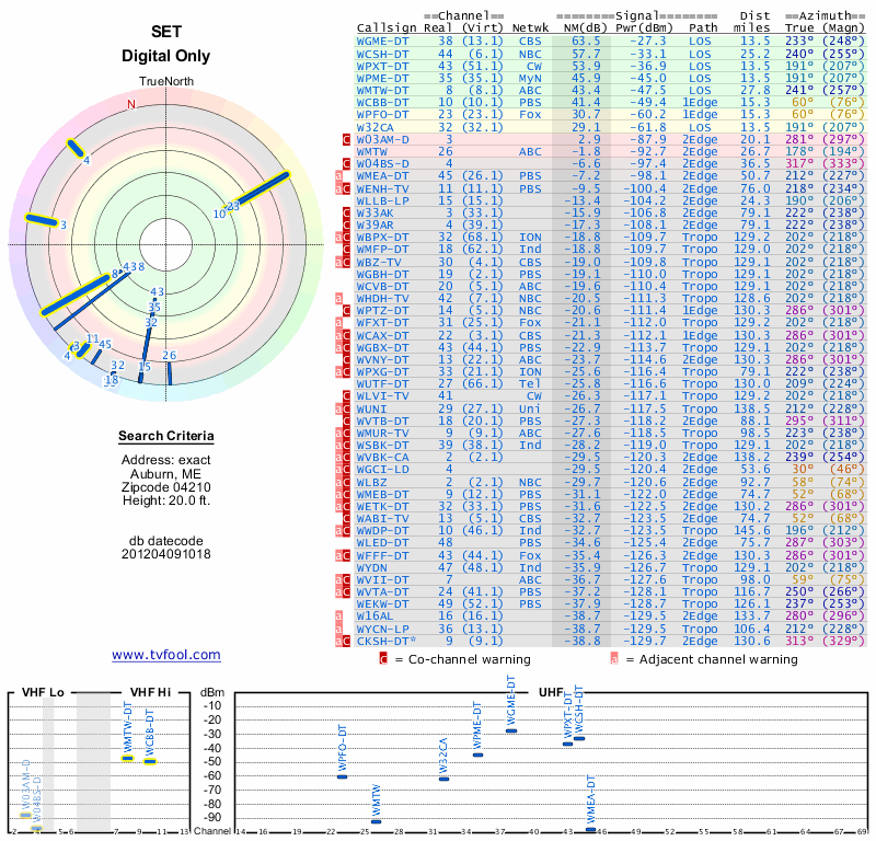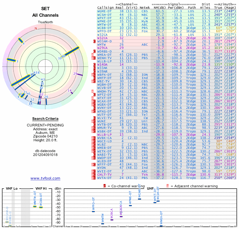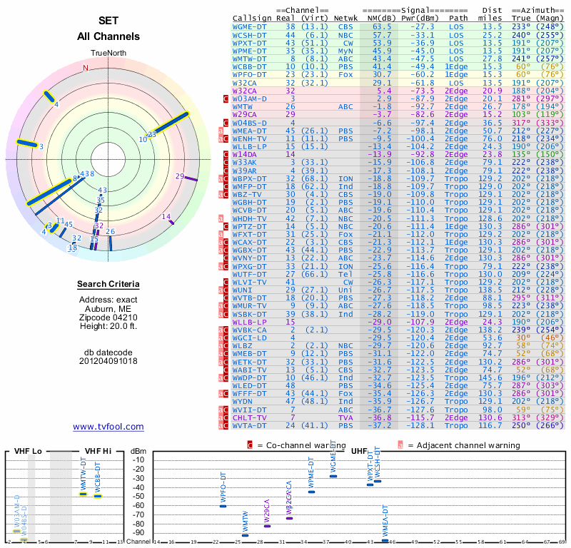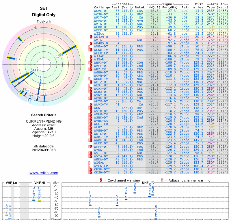 Here are the results for your location. The transmitter database was last updated on June 7, 2013. For more information about these plots and how to interpret them, please check out the Signal Analysis FAQ.