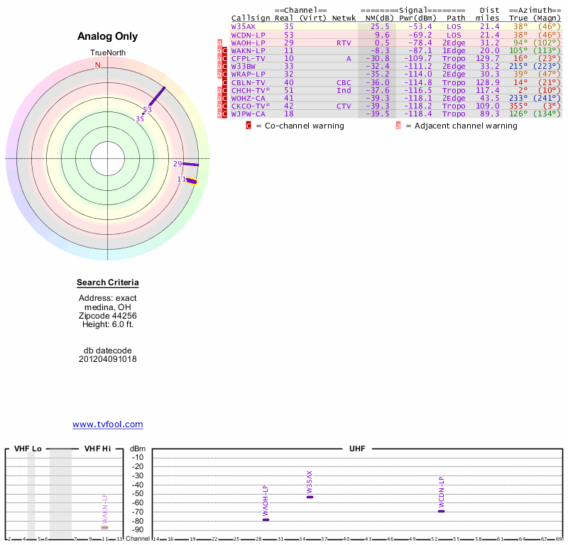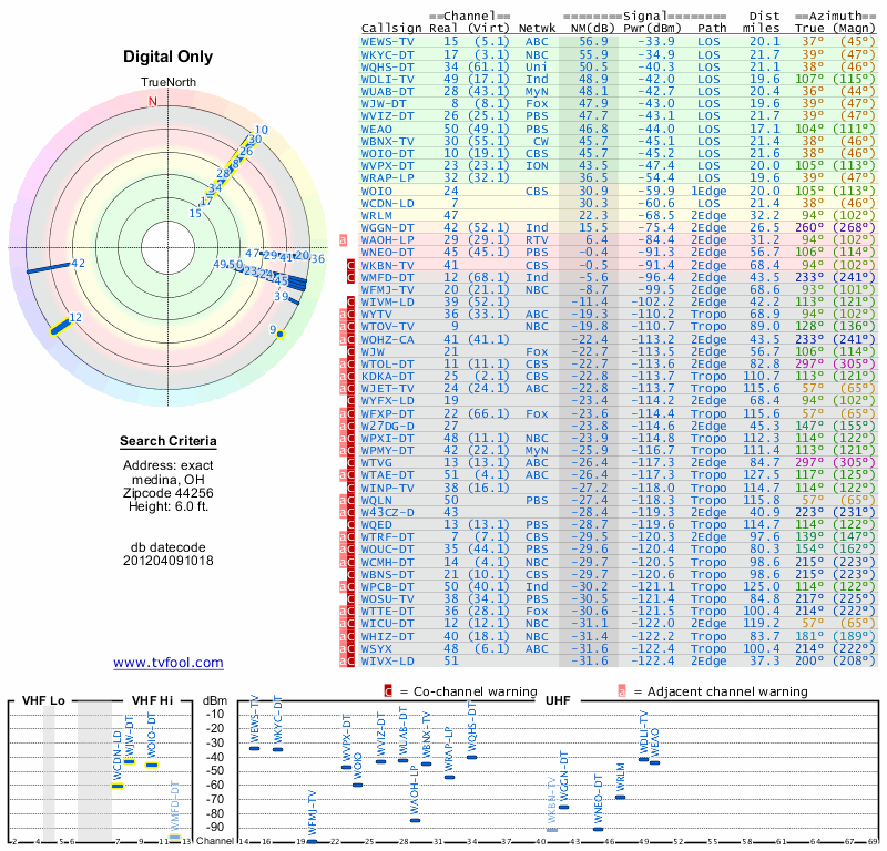 Here are the results for your location. The transmitter database was last updated on June 7, 2013. For more information about these plots and how to interpret them, please check out the Signal Analysis FAQ.