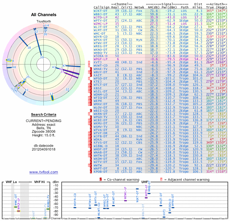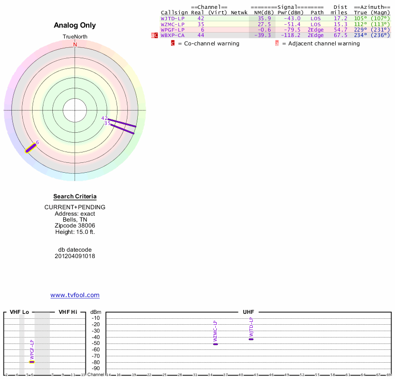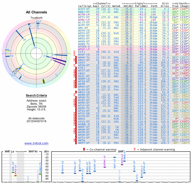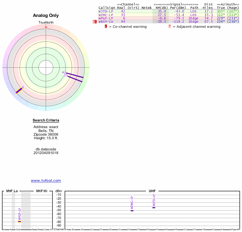 Here are the results for your location. The transmitter database was last updated on June 7, 2013. For more information about these plots and how to interpret them, please check out the Signal Analysis FAQ.