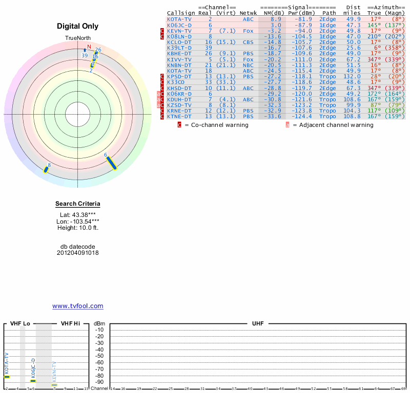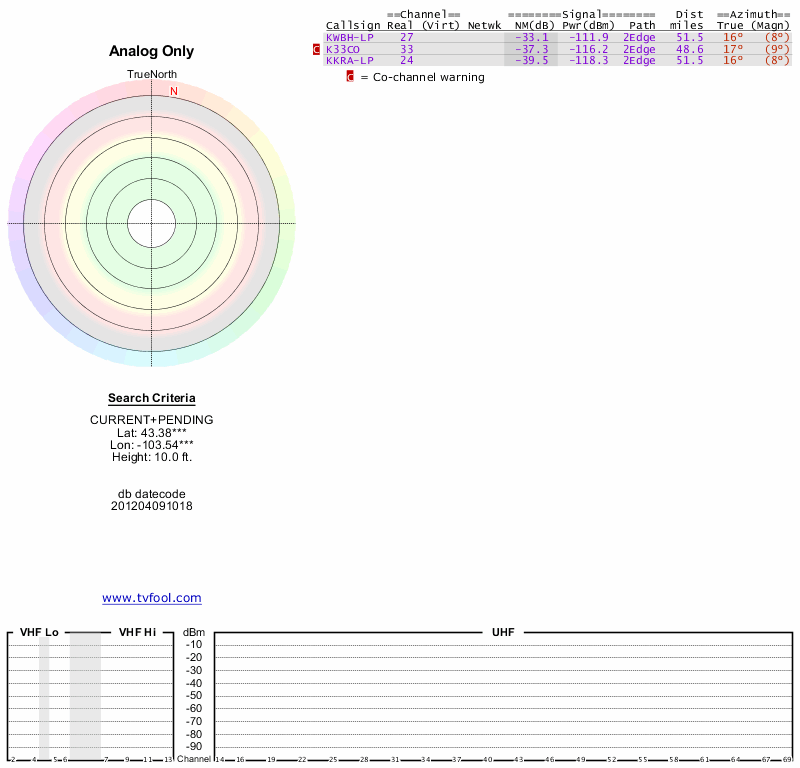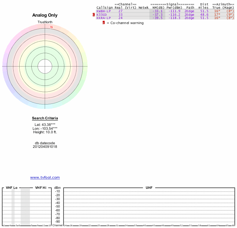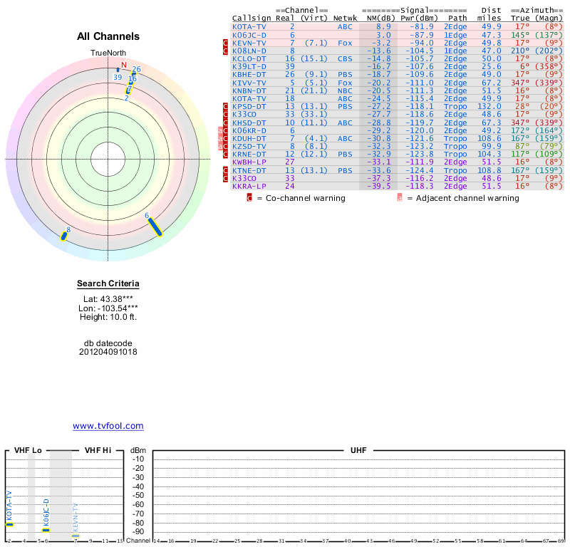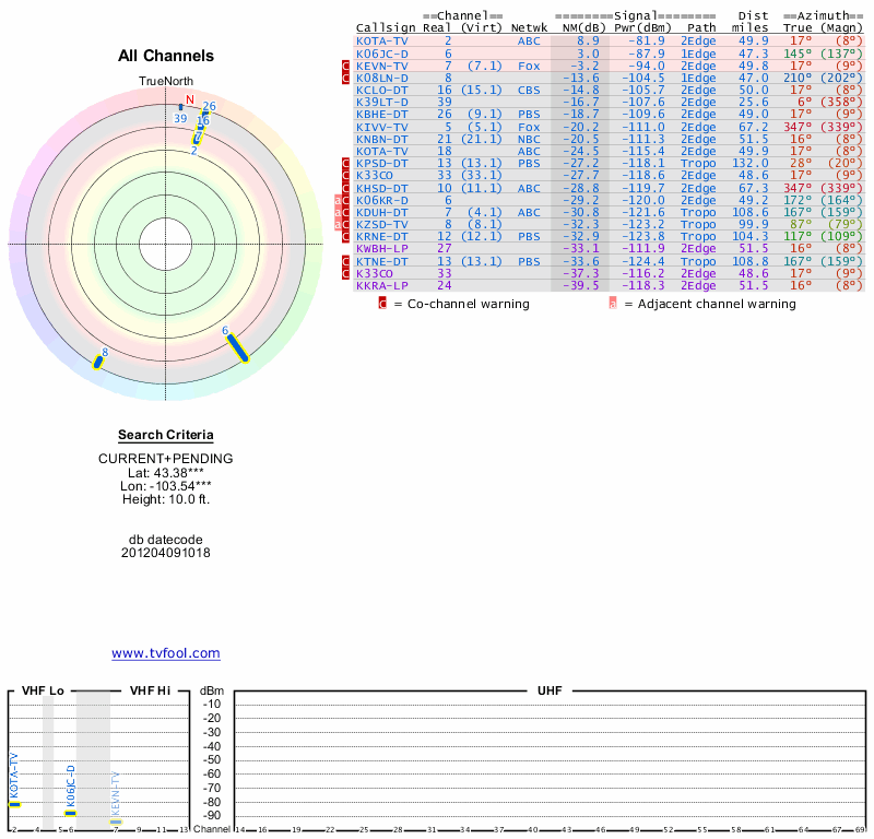 Here are the results for your location. The transmitter database was last updated on June 7, 2013. For more information about these plots and how to interpret them, please check out the Signal Analysis FAQ.