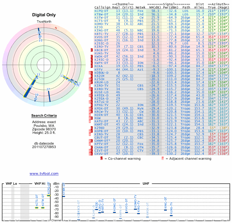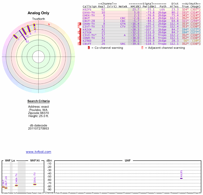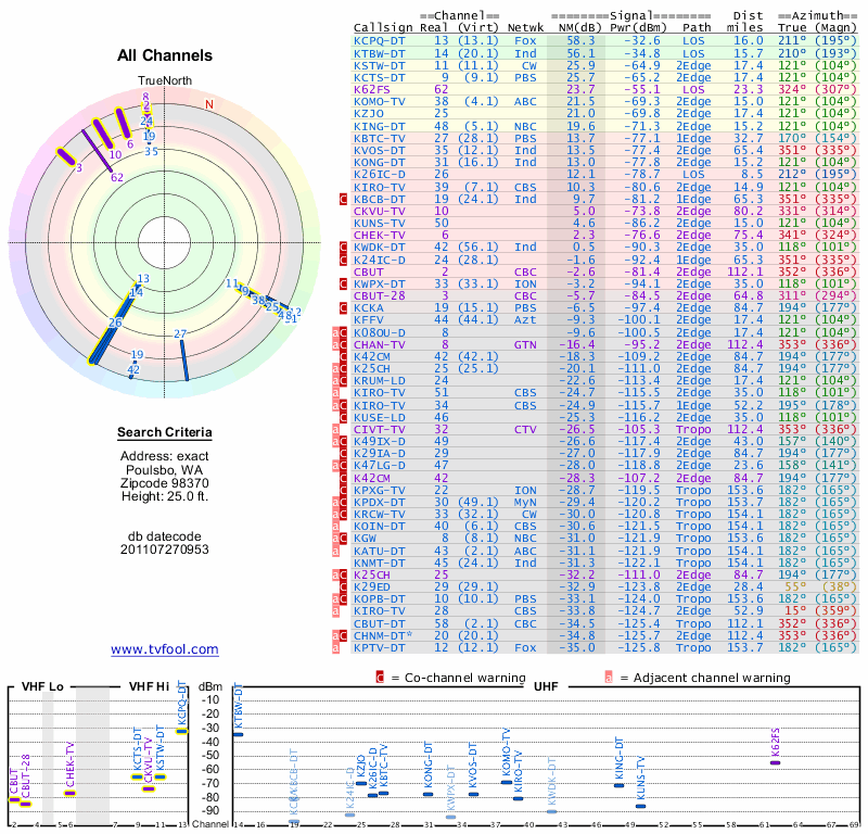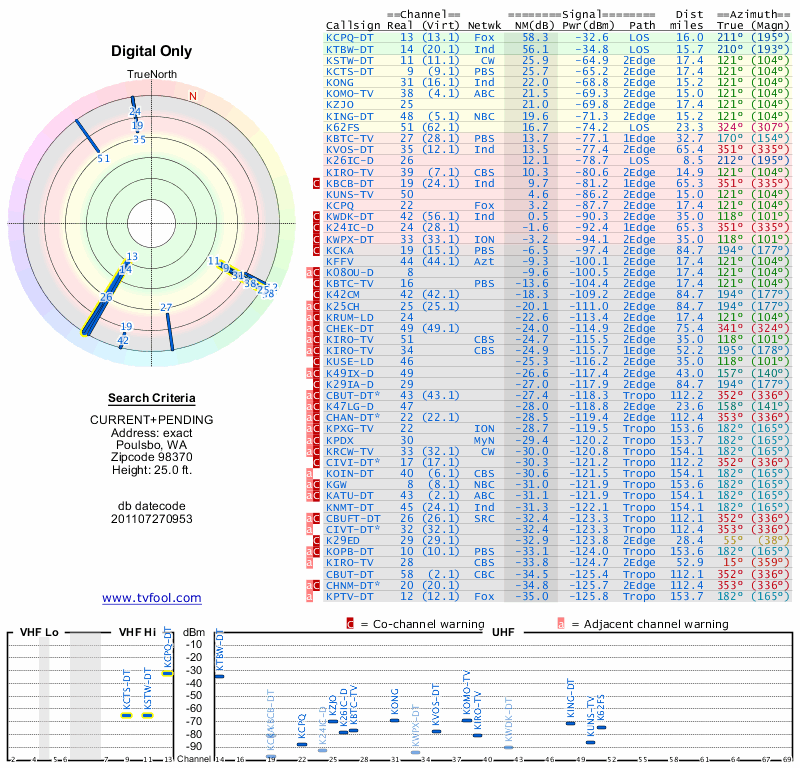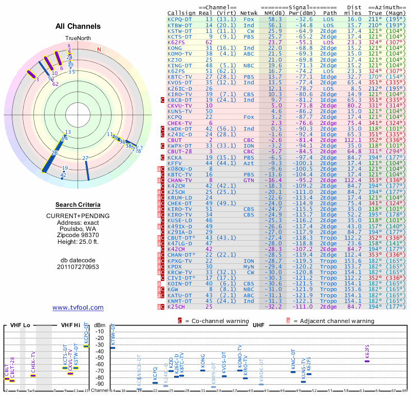 Here are the results for your location. The transmitter database was last updated on June 7, 2013. For more information about these plots and how to interpret them, please check out the Signal Analysis FAQ.