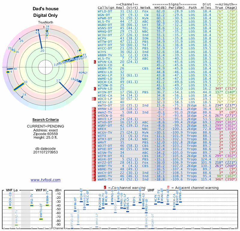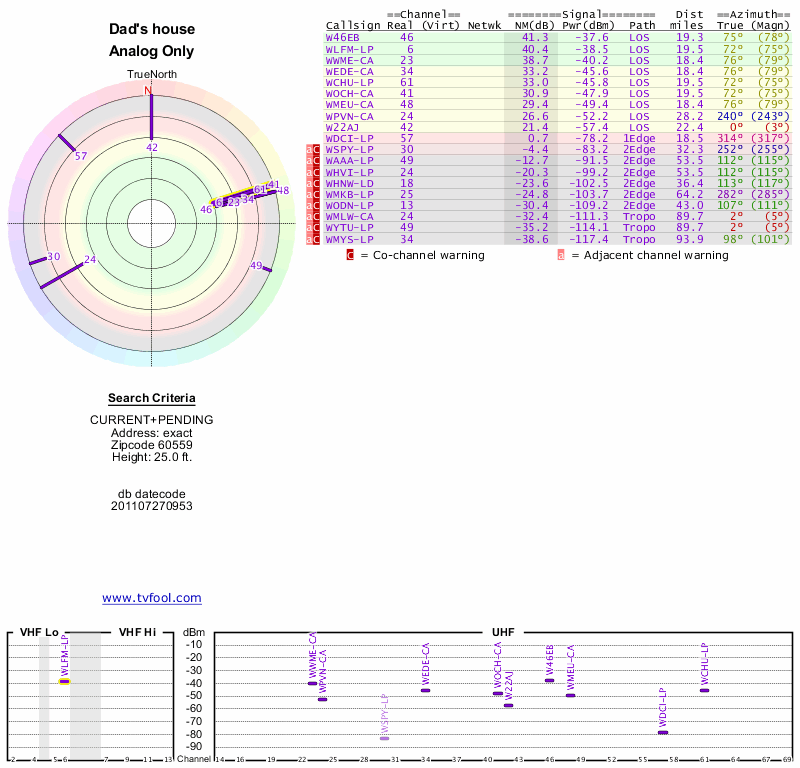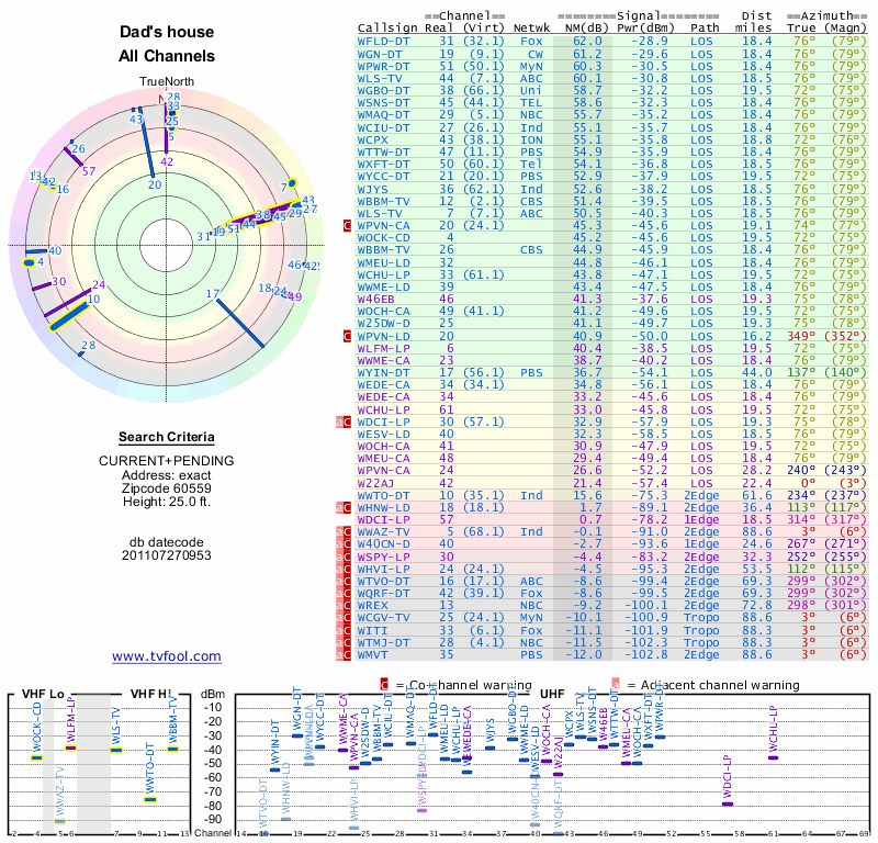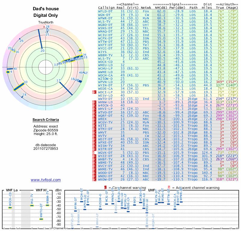 Here are the results for your location. The transmitter database was last updated on June 7, 2013. For more information about these plots and how to interpret them, please check out the Signal Analysis FAQ.
