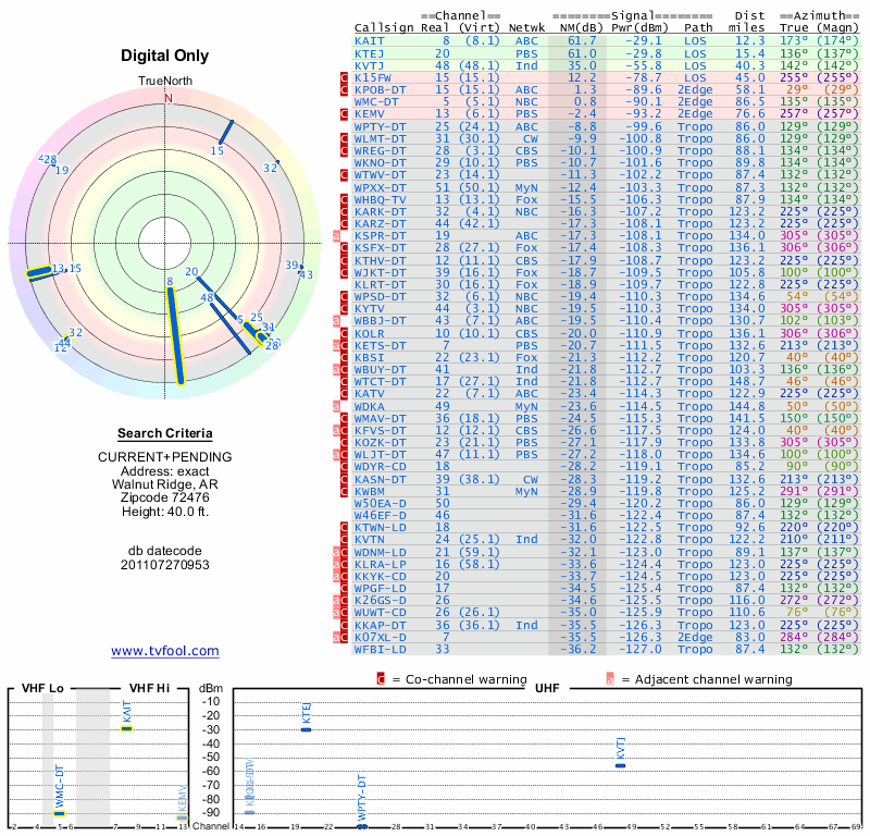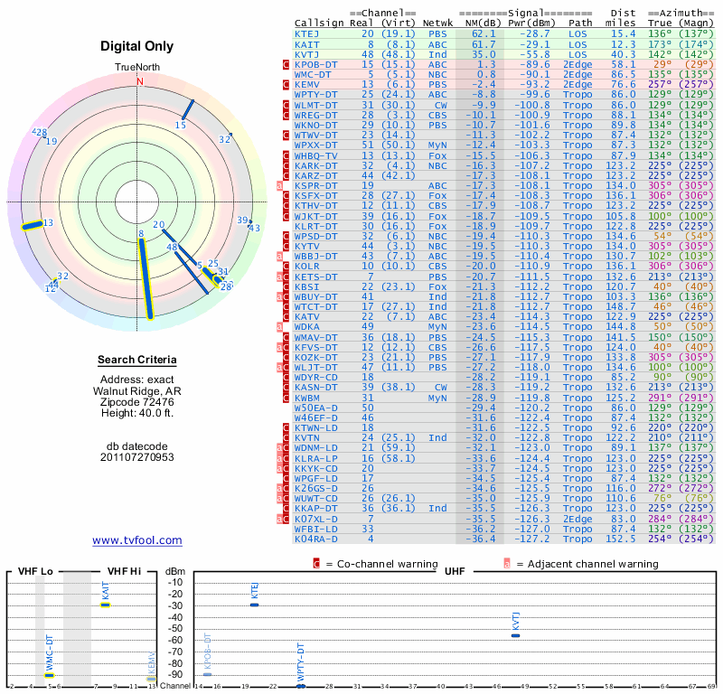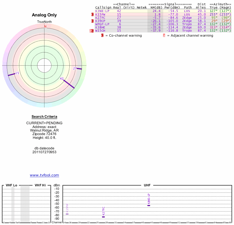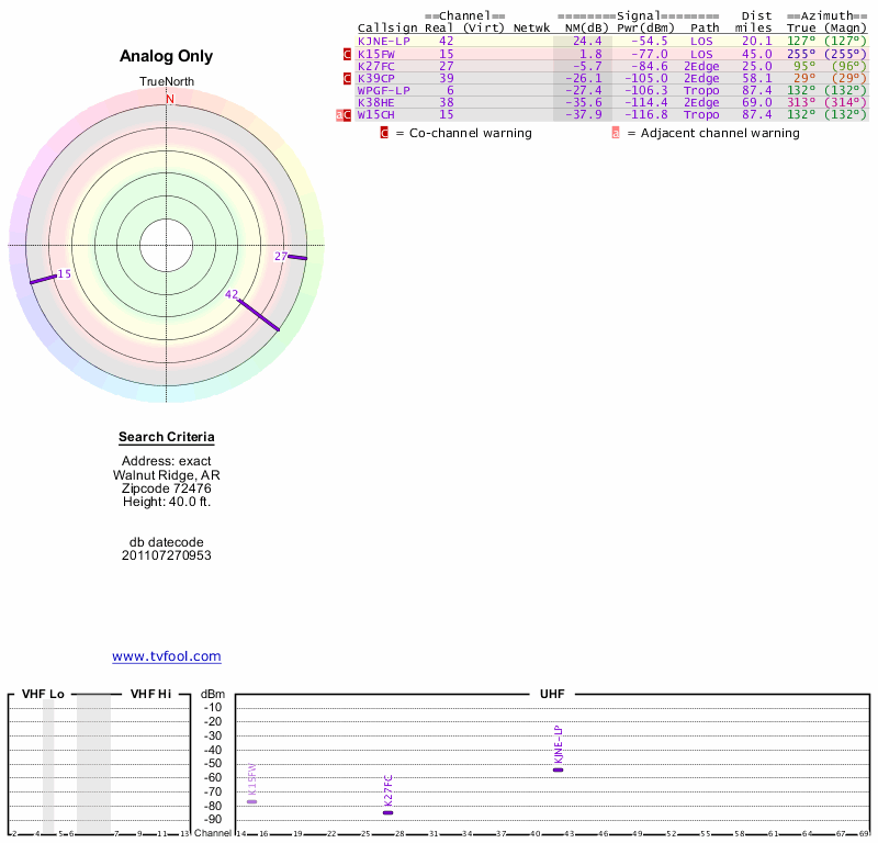 Here are the results for your location. The transmitter database was last updated on June 7, 2013. For more information about these plots and how to interpret them, please check out the Signal Analysis FAQ.