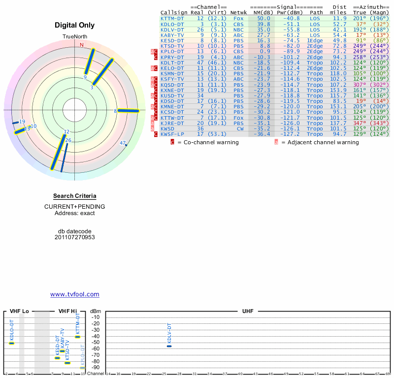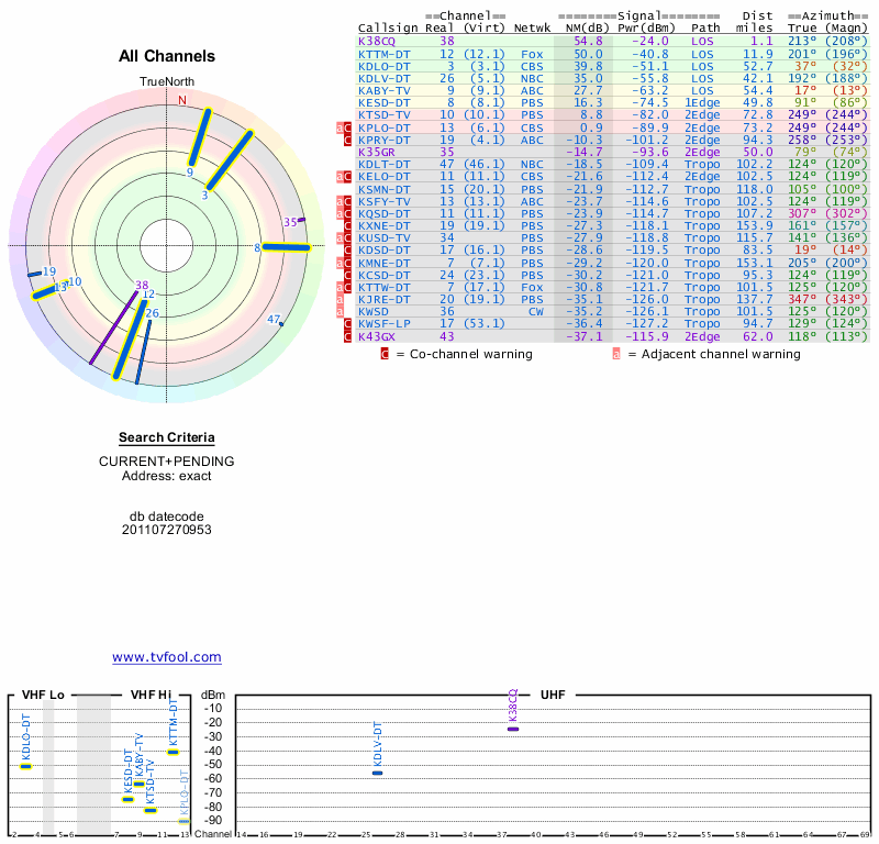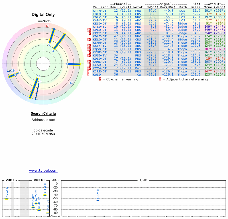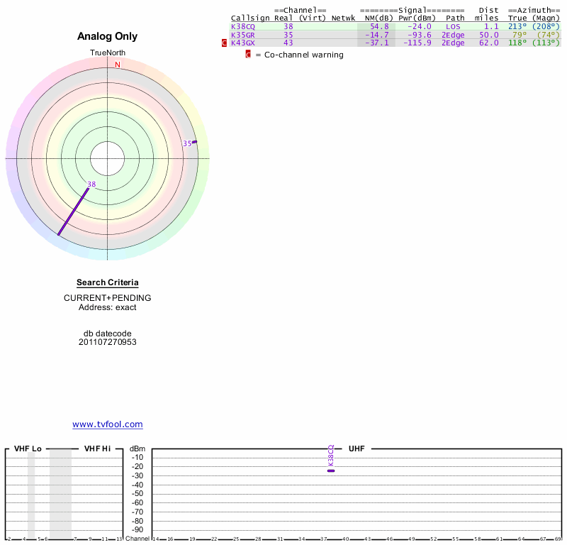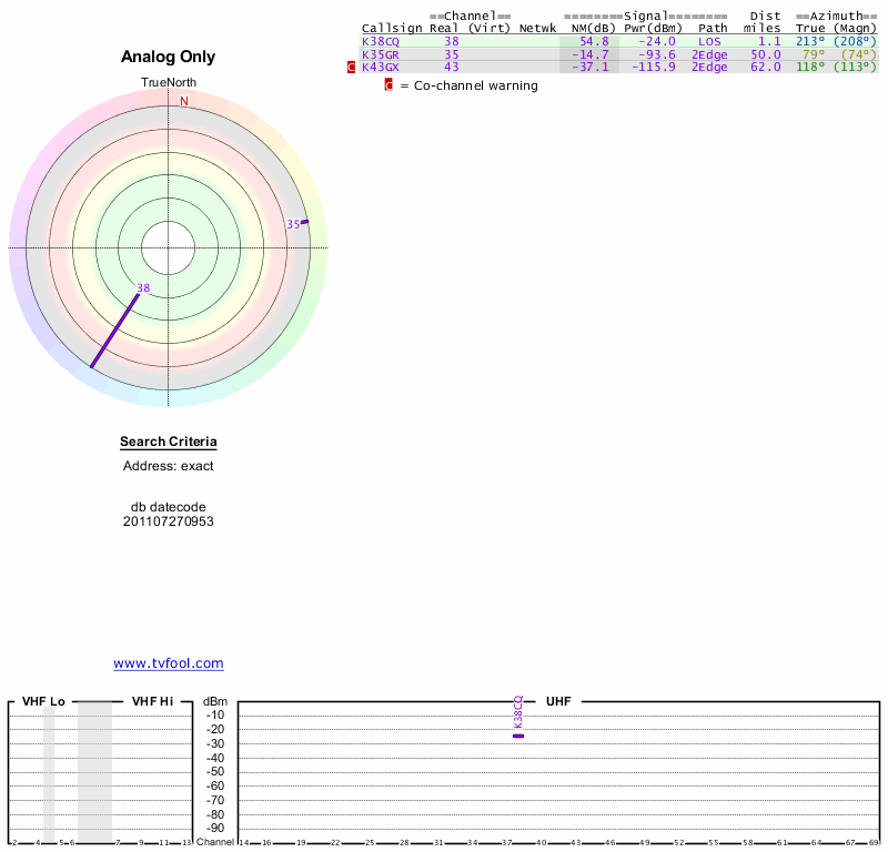 Here are the results for your location. The transmitter database was last updated on June 7, 2013. For more information about these plots and how to interpret them, please check out the Signal Analysis FAQ.