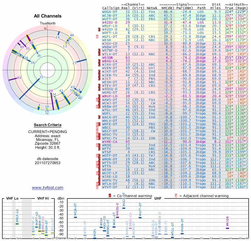 Here are the results for your location. The transmitter database was last updated on June 7, 2013. For more information about these plots and how to interpret them, please check out the Signal Analysis FAQ.