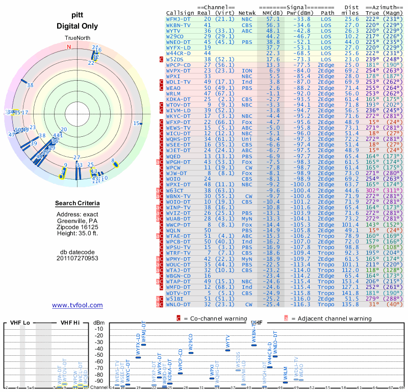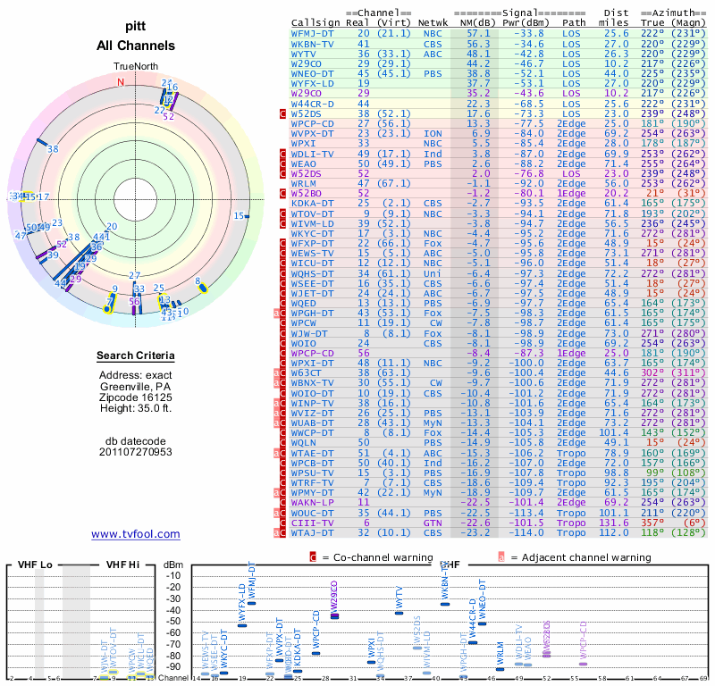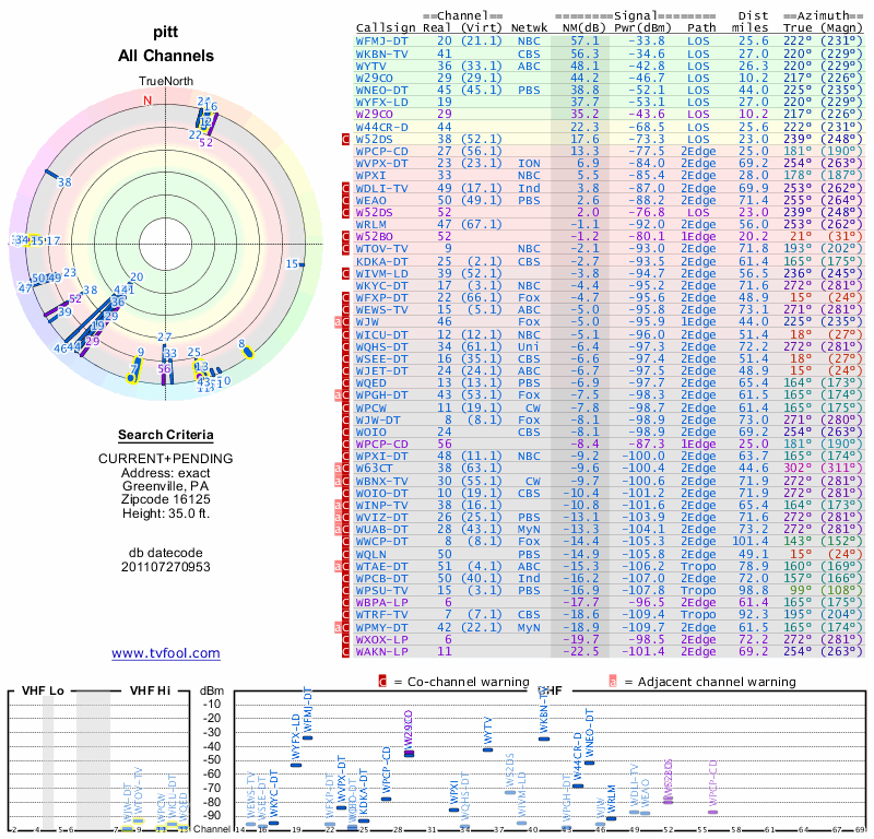 Here are the results for your location. The transmitter database was last updated on June 7, 2013. For more information about these plots and how to interpret them, please check out the Signal Analysis FAQ.