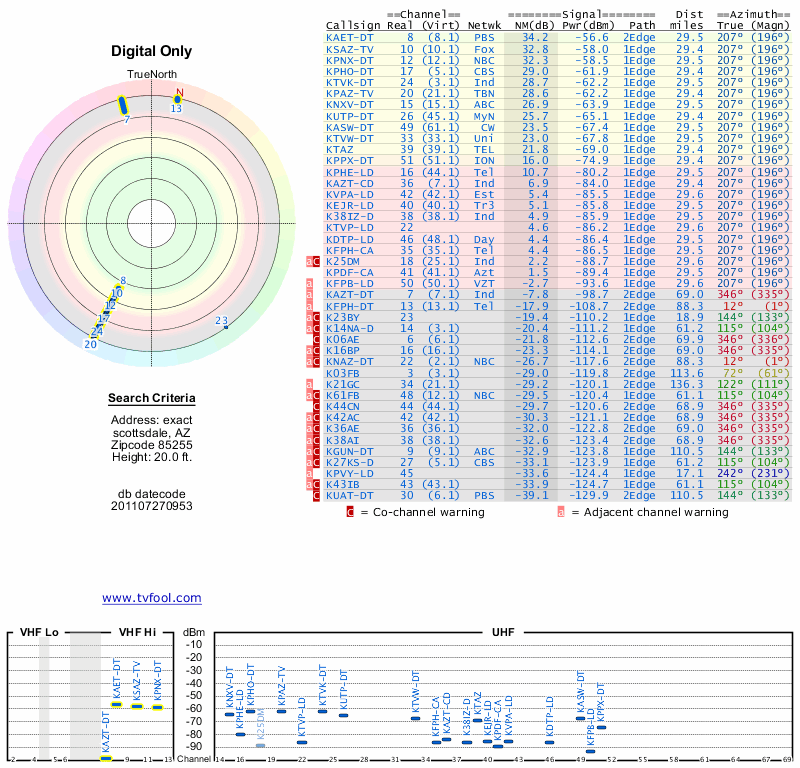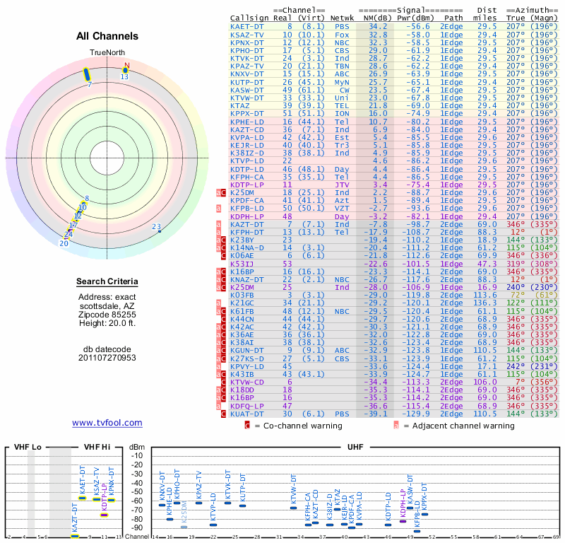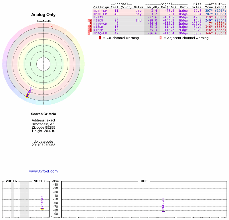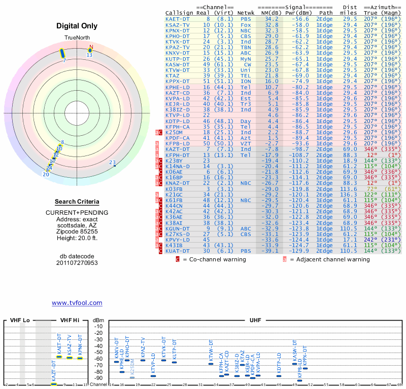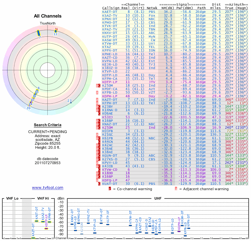Here are the results for your location. The transmitter database was last updated on June 7, 2013. For more information about these plots and how to interpret them, please check out the Signal Analysis FAQ.