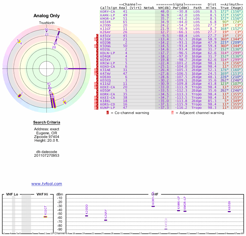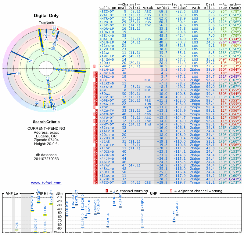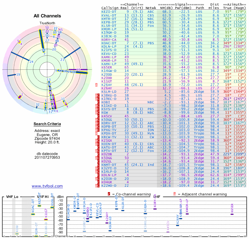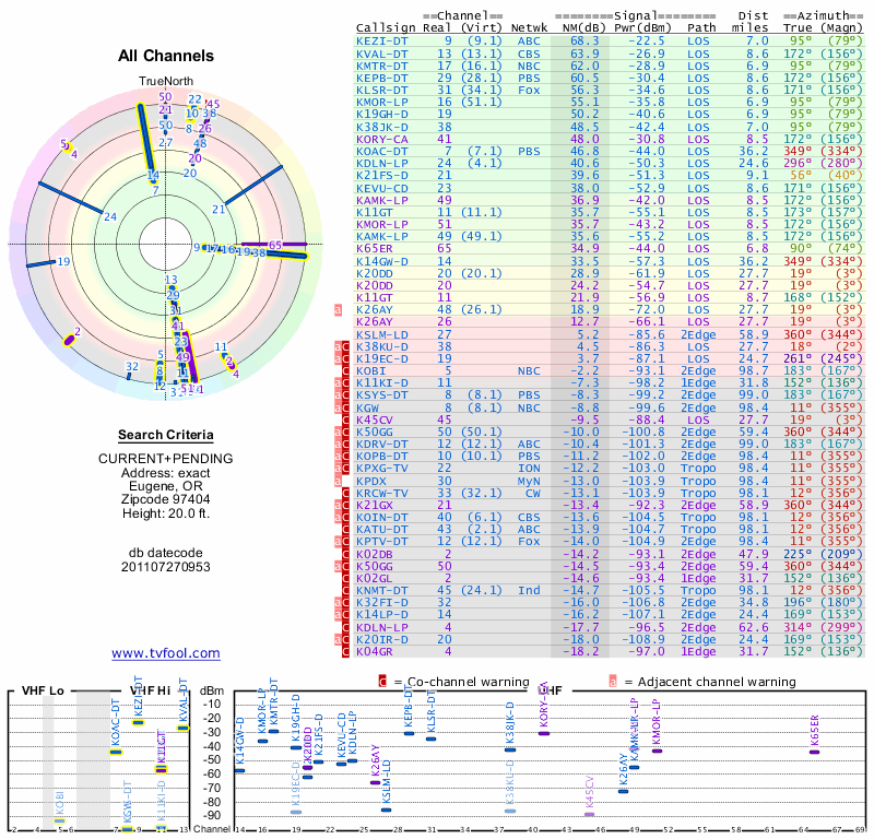 Here are the results for your location. The transmitter database was last updated on June 7, 2013. For more information about these plots and how to interpret them, please check out the Signal Analysis FAQ.