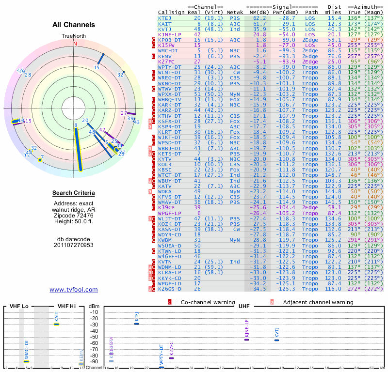 Here are the results for your location. The transmitter database was last updated on June 7, 2013. For more information about these plots and how to interpret them, please check out the Signal Analysis FAQ.