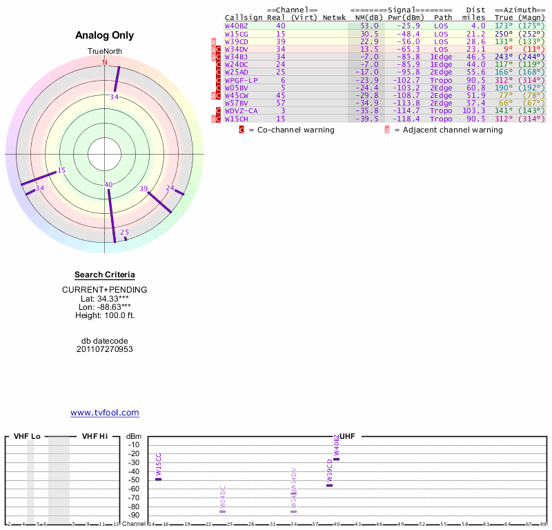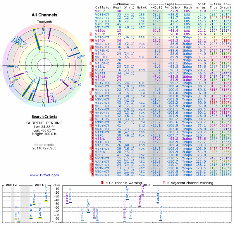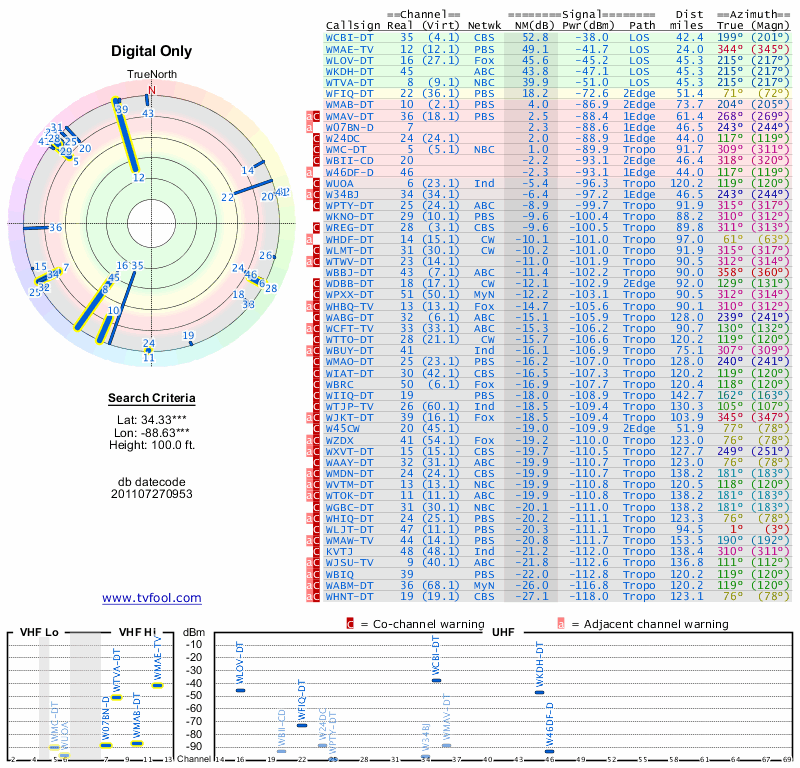 Here are the results for your location. The transmitter database was last updated on June 7, 2013. For more information about these plots and how to interpret them, please check out the Signal Analysis FAQ.