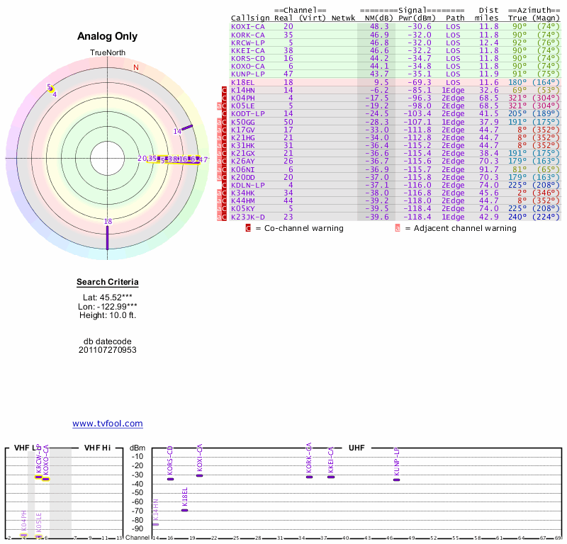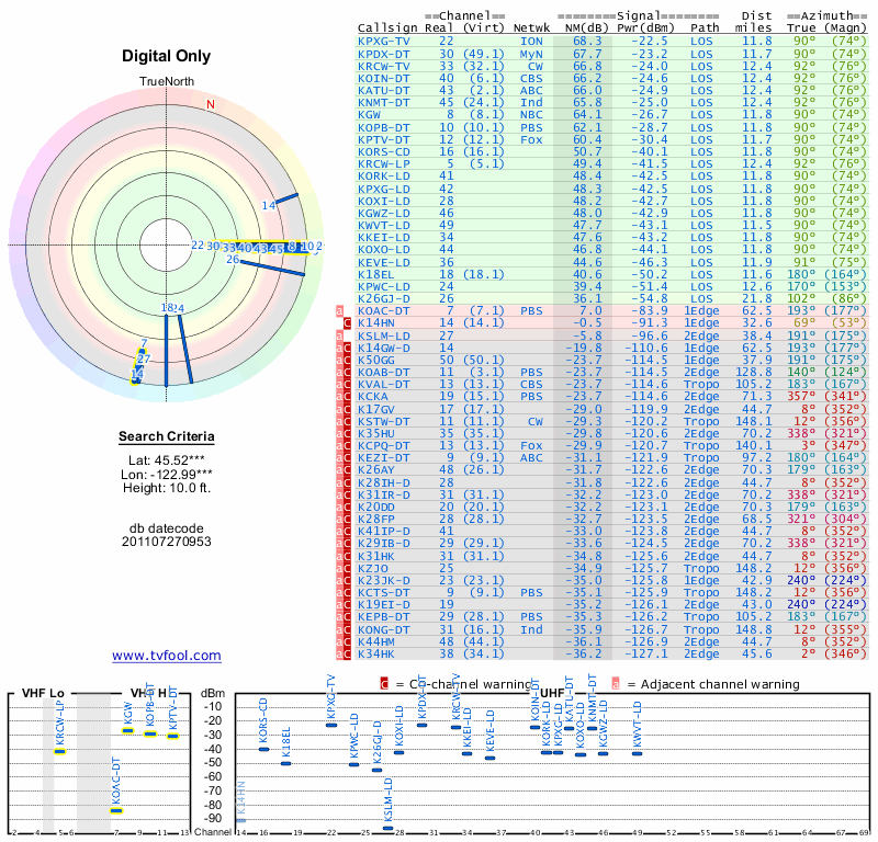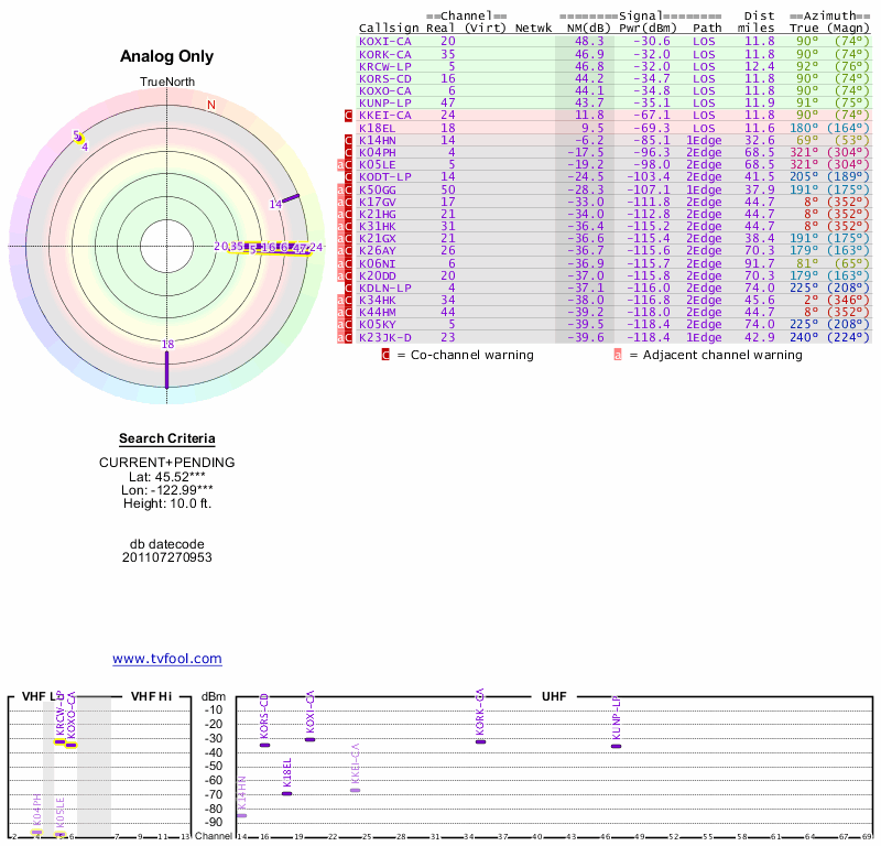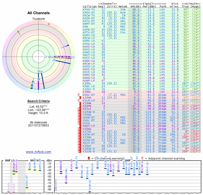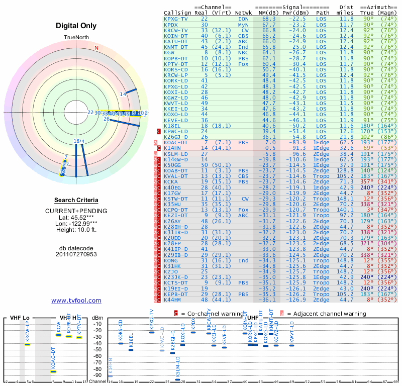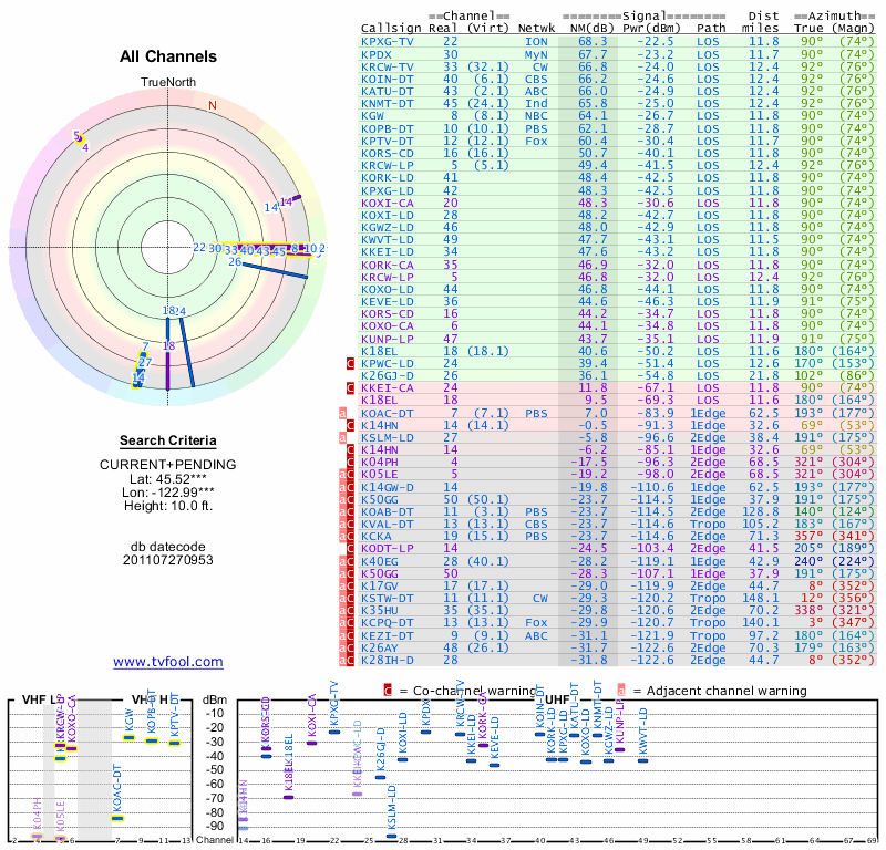 Here are the results for your location. The transmitter database was last updated on June 7, 2013. For more information about these plots and how to interpret them, please check out the Signal Analysis FAQ.