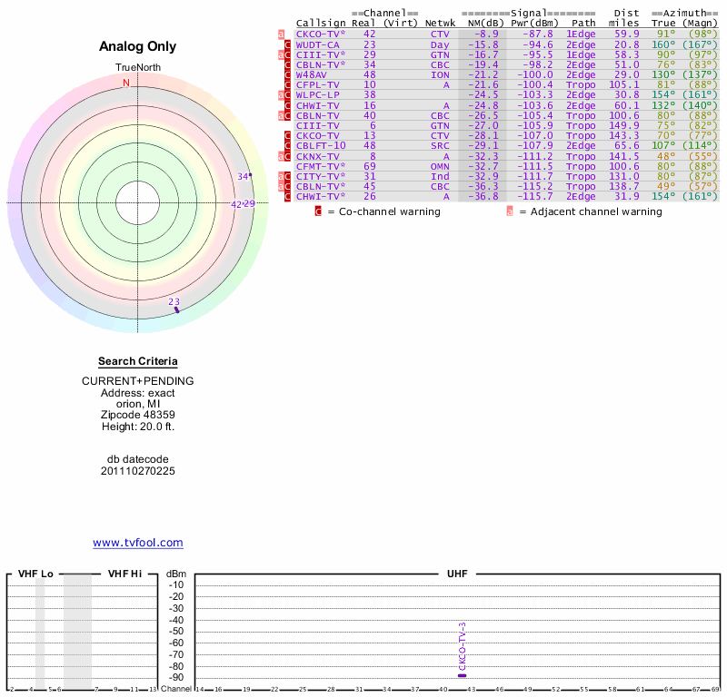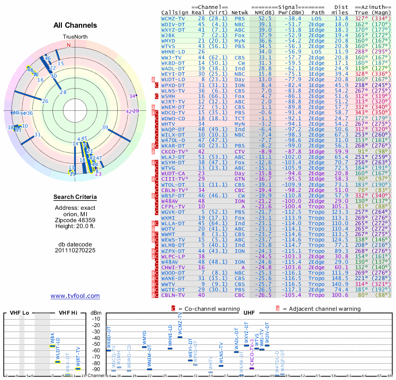 Here are the results for your location. The transmitter database was last updated on June 7, 2013. For more information about these plots and how to interpret them, please check out the Signal Analysis FAQ.