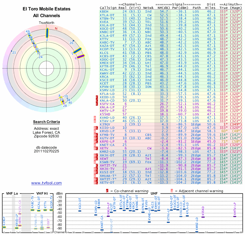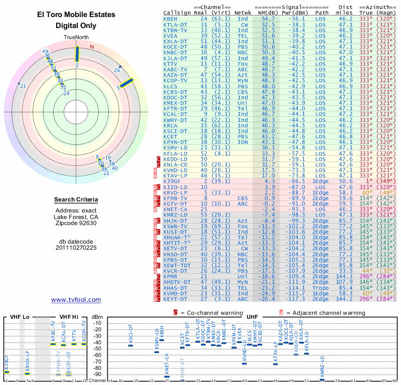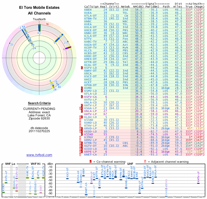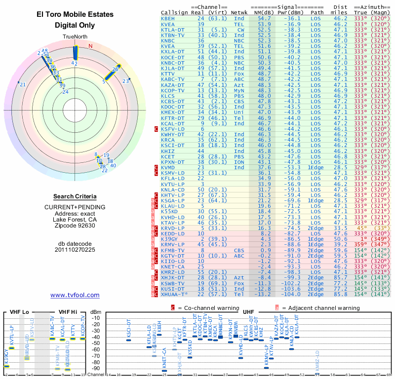Here are the results for your location. The transmitter database was last updated on June 7, 2013. For more information about these plots and how to interpret them, please check out the Signal Analysis FAQ.