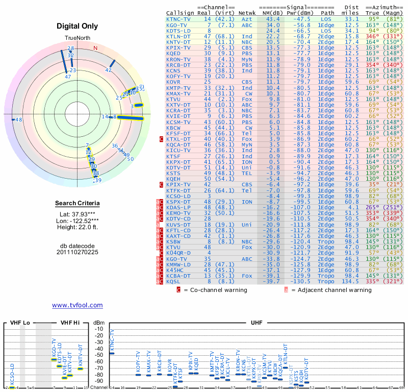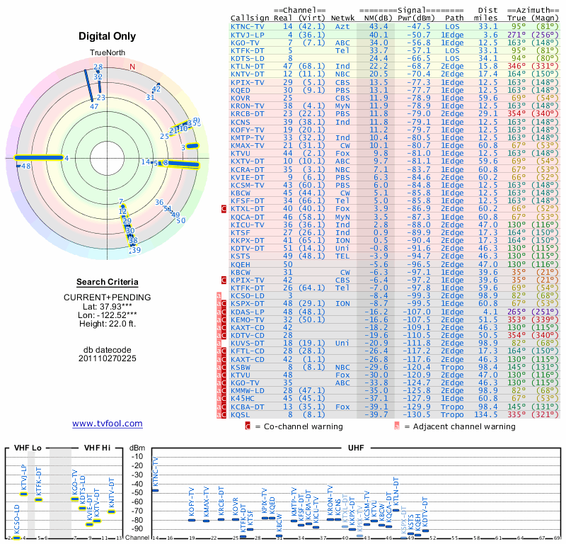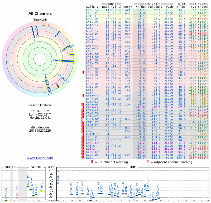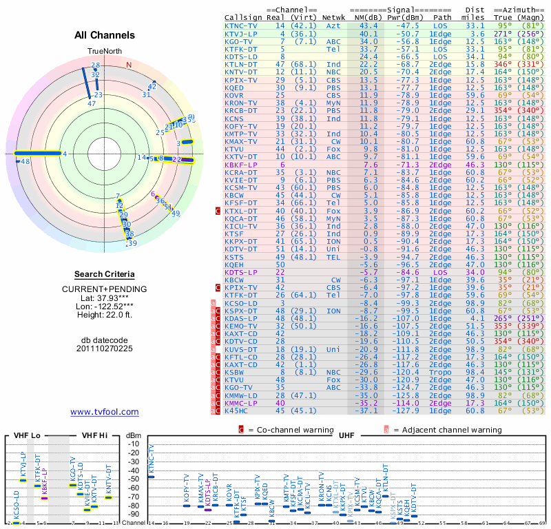 Here are the results for your location. The transmitter database was last updated on June 7, 2013. For more information about these plots and how to interpret them, please check out the Signal Analysis FAQ.