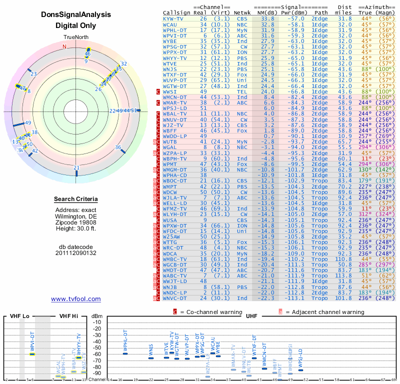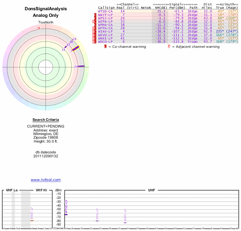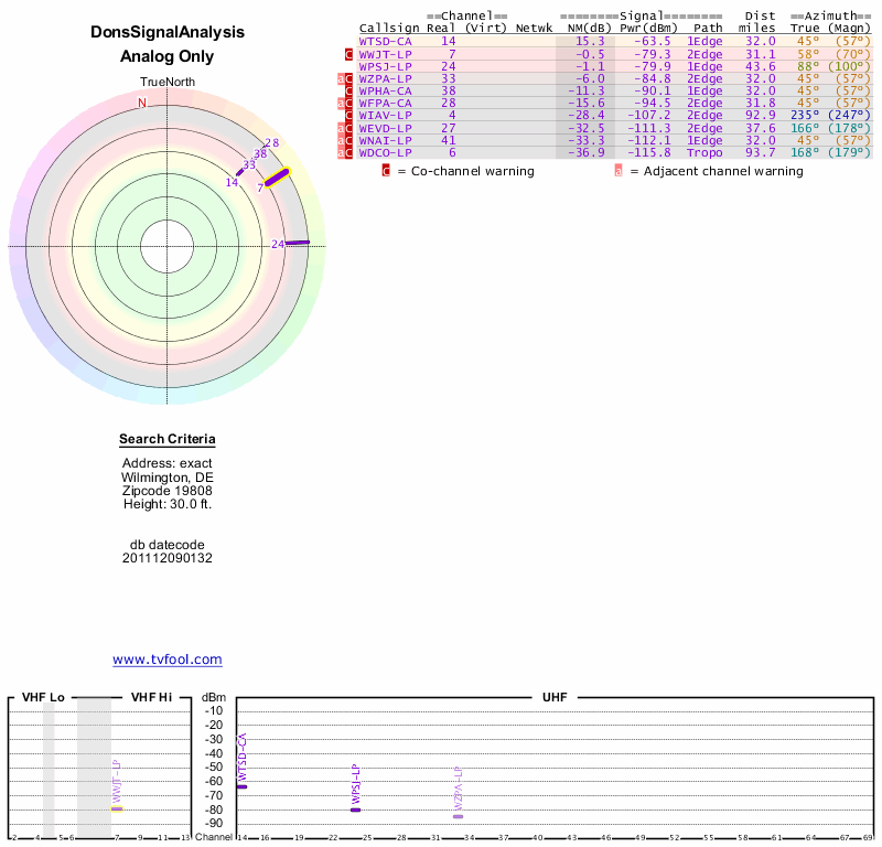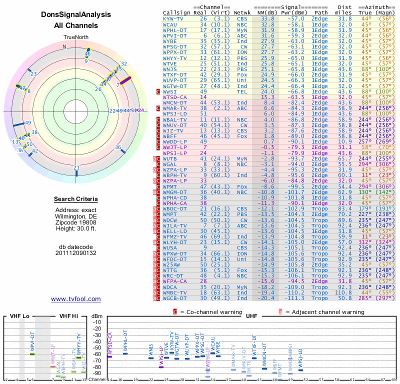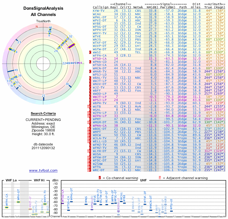 Here are the results for your location. The transmitter database was last updated on June 7, 2013. For more information about these plots and how to interpret them, please check out the Signal Analysis FAQ.