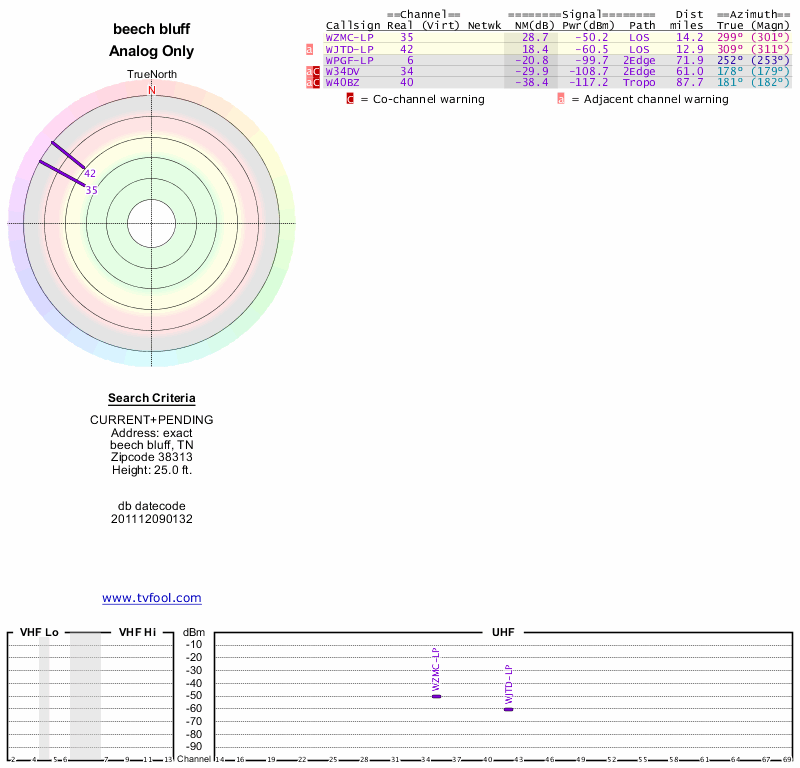 Here are the results for your location. The transmitter database was last updated on June 7, 2013. For more information about these plots and how to interpret them, please check out the Signal Analysis FAQ.