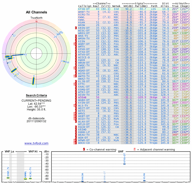 Here are the results for your location. The transmitter database was last updated on June 7, 2013. For more information about these plots and how to interpret them, please check out the Signal Analysis FAQ.