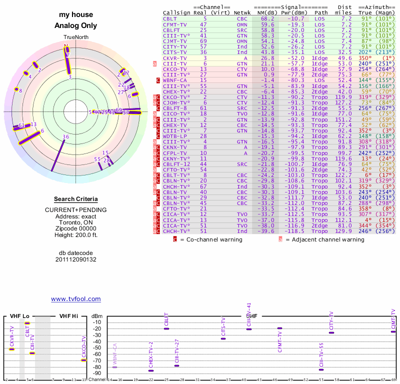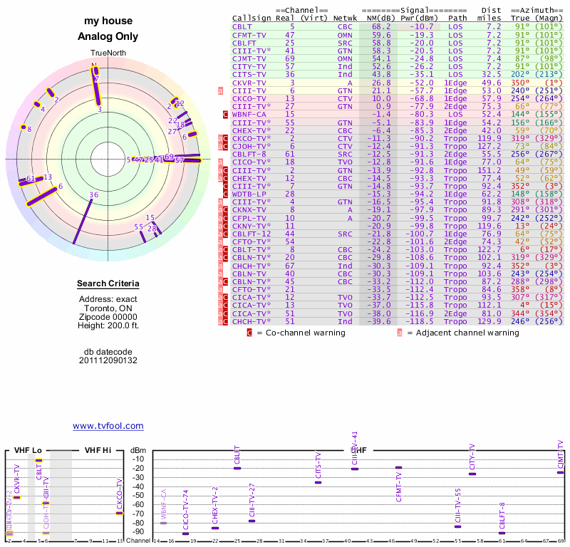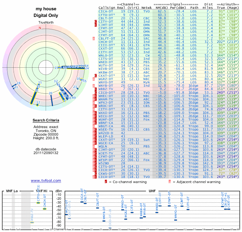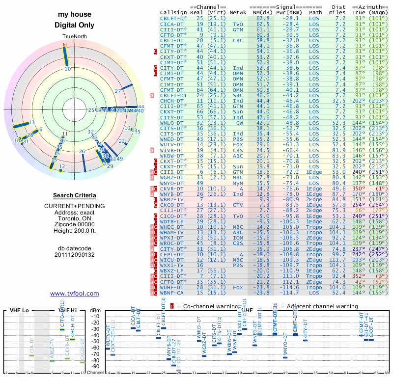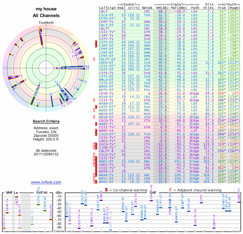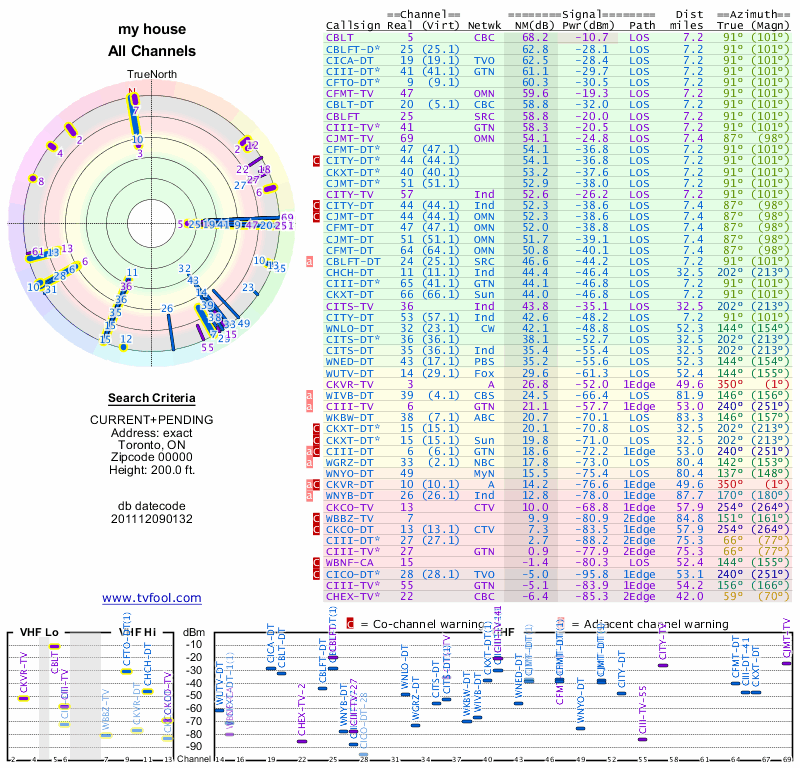Here are the results for your location. The transmitter database was last updated on June 7, 2013. For more information about these plots and how to interpret them, please check out the Signal Analysis FAQ.