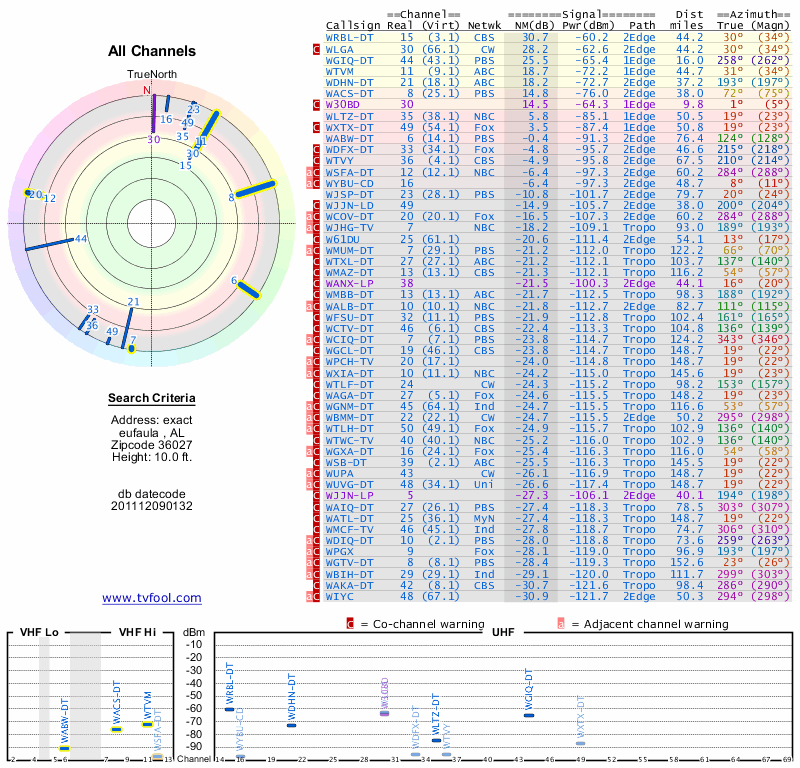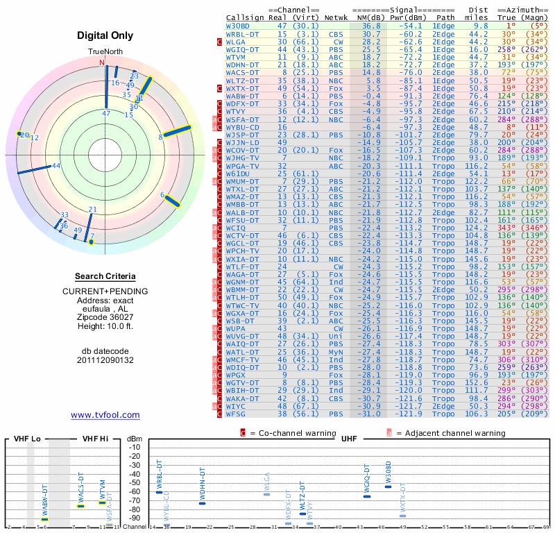 Here are the results for your location. The transmitter database was last updated on June 7, 2013. For more information about these plots and how to interpret them, please check out the Signal Analysis FAQ.