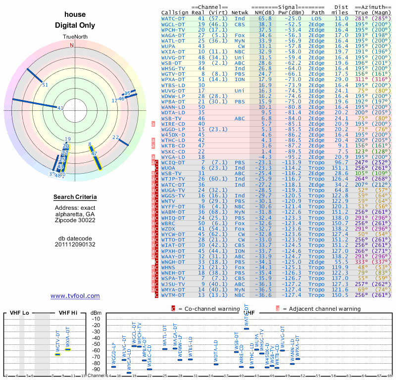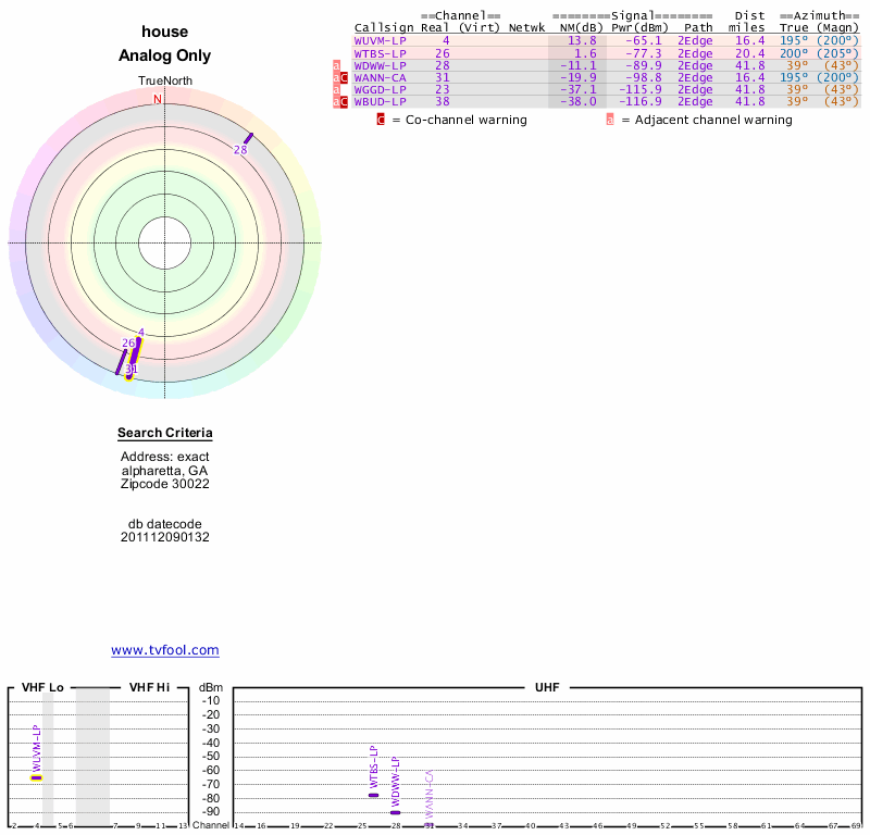 Here are the results for your location. The transmitter database was last updated on June 7, 2013. For more information about these plots and how to interpret them, please check out the Signal Analysis FAQ.