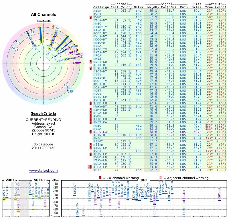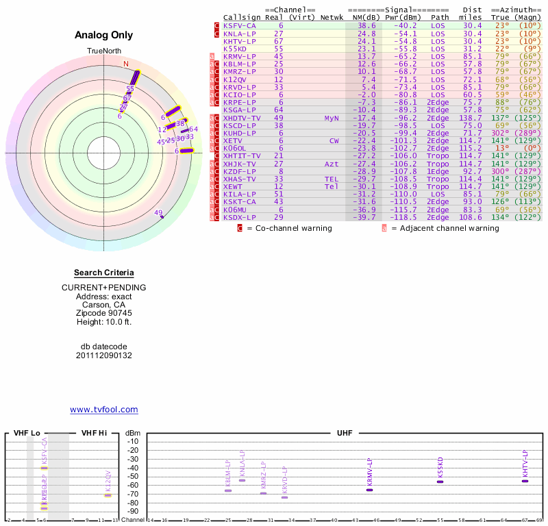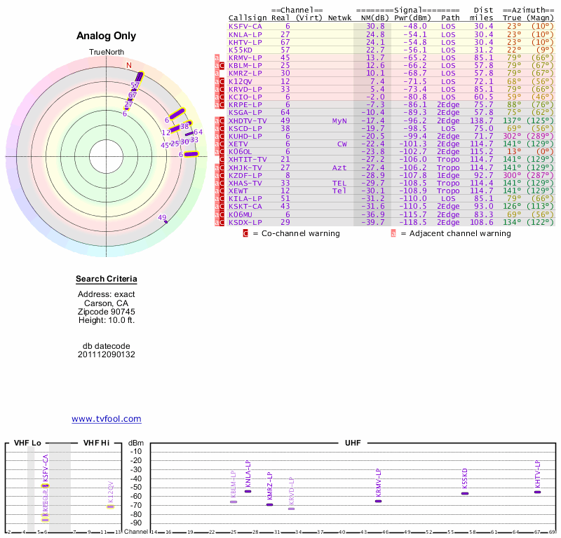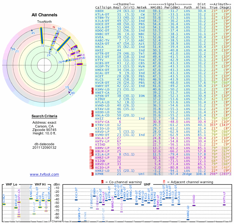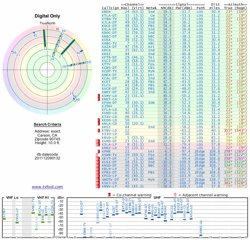 Here are the results for your location. The transmitter database was last updated on June 7, 2013. For more information about these plots and how to interpret them, please check out the Signal Analysis FAQ.