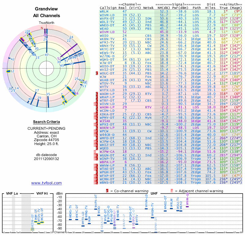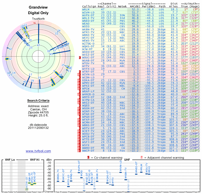 Here are the results for your location. The transmitter database was last updated on June 7, 2013. For more information about these plots and how to interpret them, please check out the Signal Analysis FAQ.