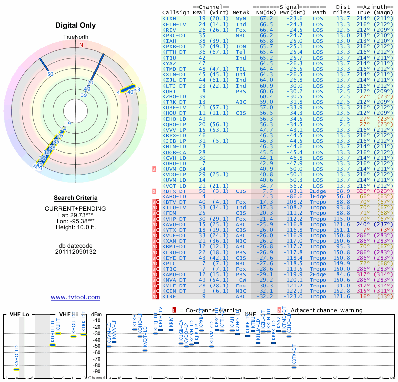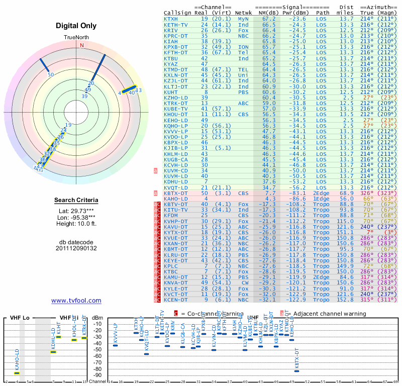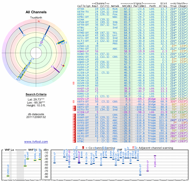Here are the results for your location. The transmitter database was last updated on June 7, 2013. For more information about these plots and how to interpret them, please check out the Signal Analysis FAQ.
