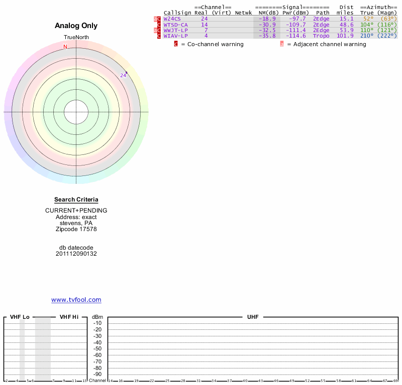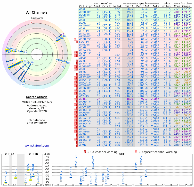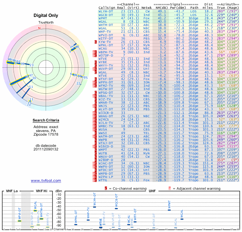 Here are the results for your location. The transmitter database was last updated on June 7, 2013. For more information about these plots and how to interpret them, please check out the Signal Analysis FAQ.