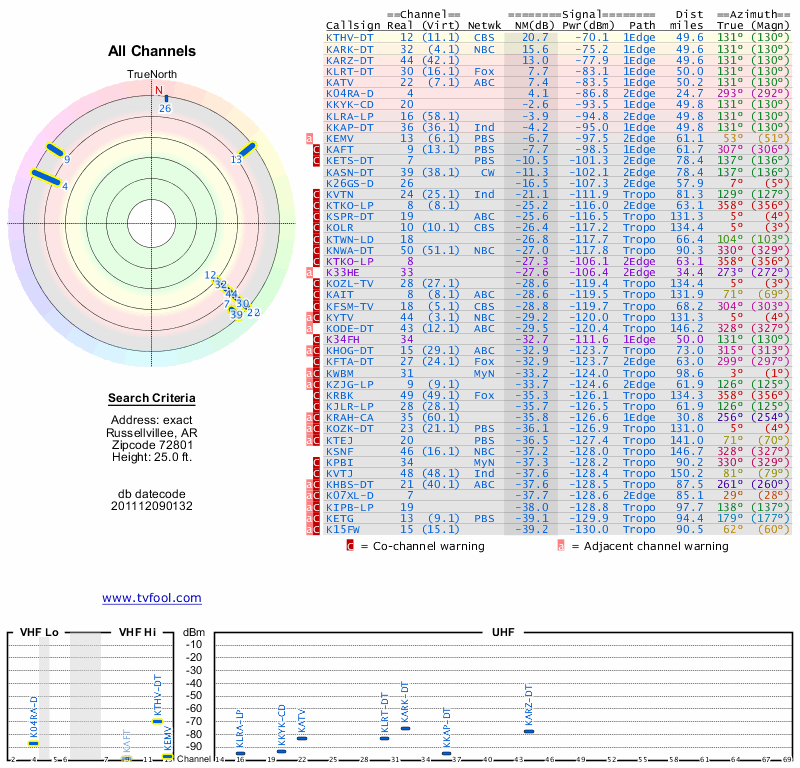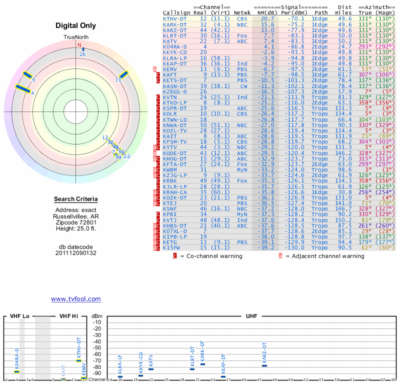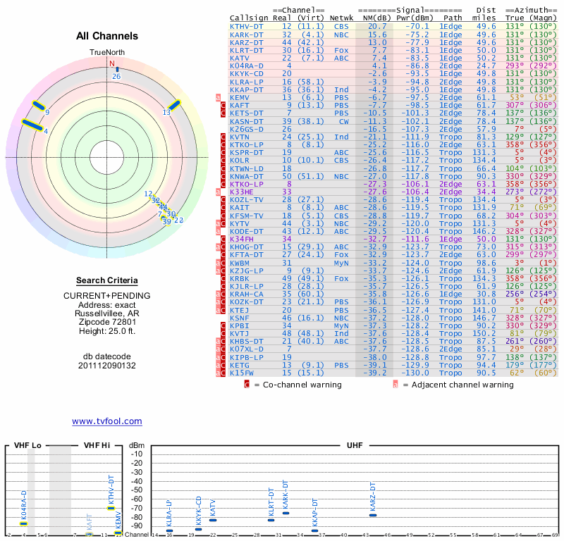 Here are the results for your location. The transmitter database was last updated on June 7, 2013. For more information about these plots and how to interpret them, please check out the Signal Analysis FAQ.