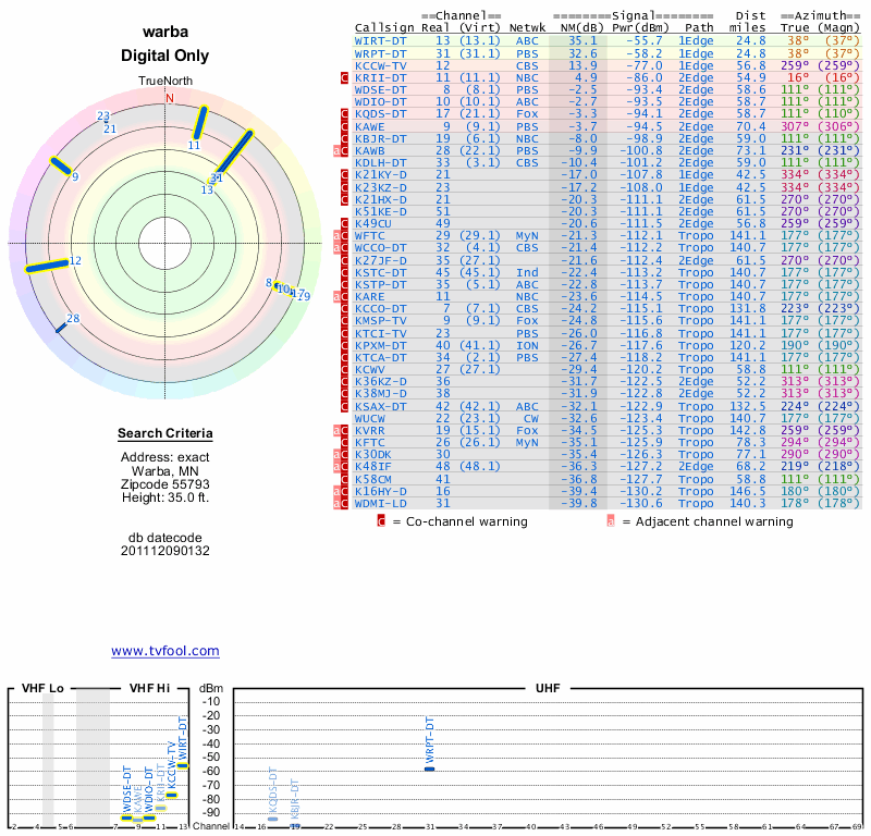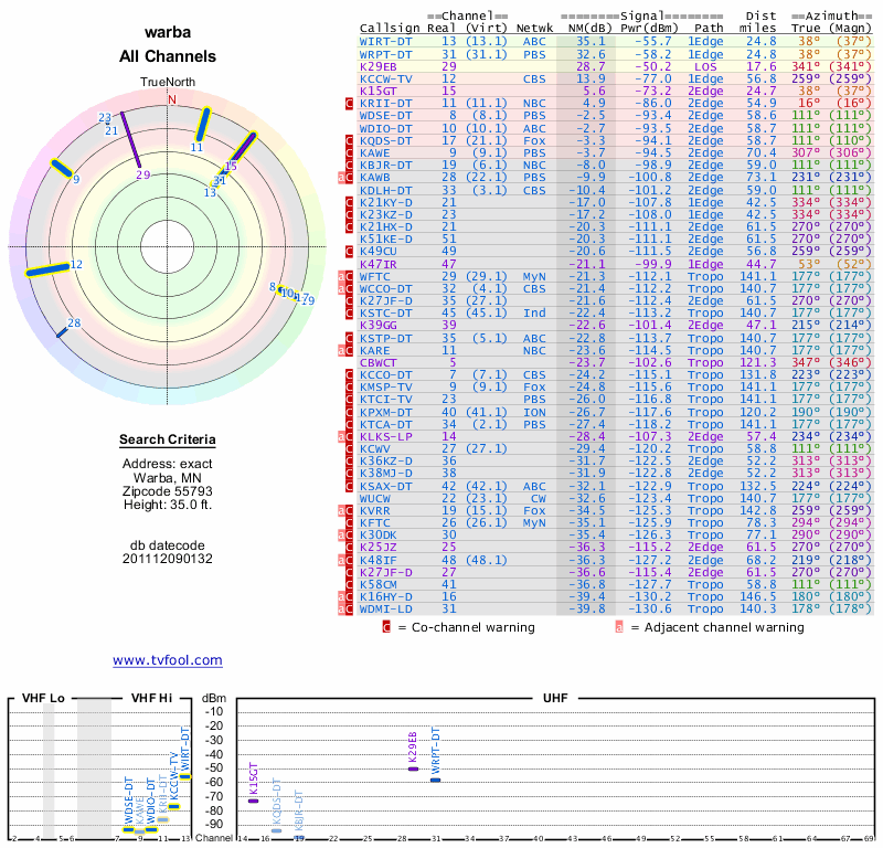 Here are the results for your location. The transmitter database was last updated on June 7, 2013. For more information about these plots and how to interpret them, please check out the Signal Analysis FAQ.