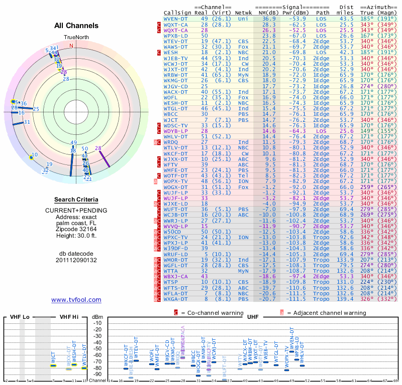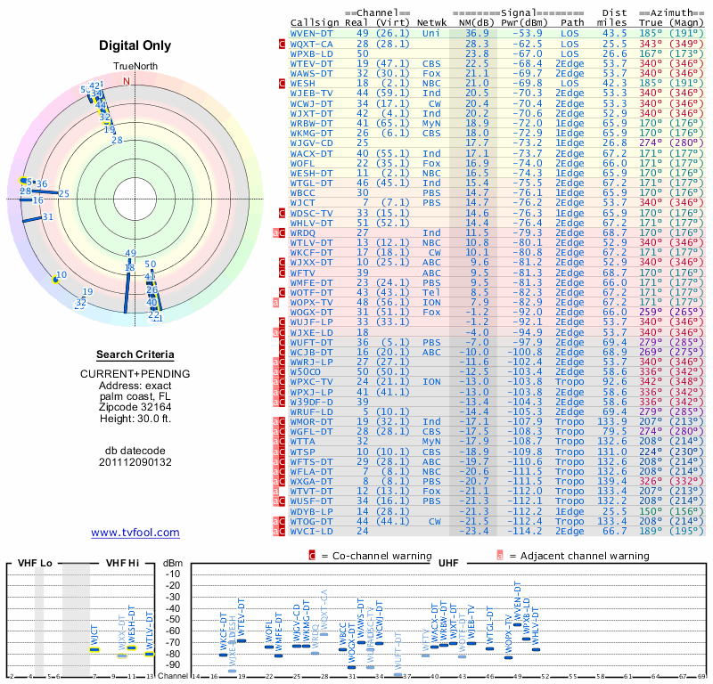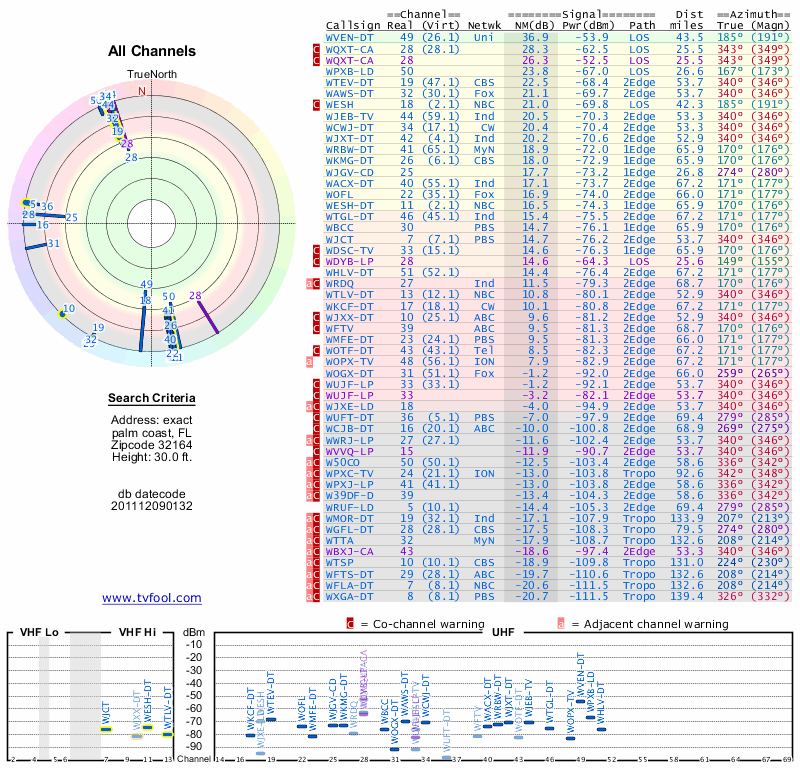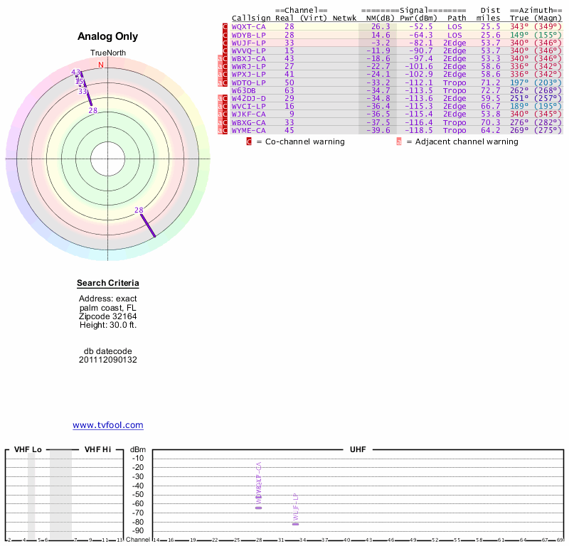 Here are the results for your location. The transmitter database was last updated on June 7, 2013. For more information about these plots and how to interpret them, please check out the Signal Analysis FAQ.