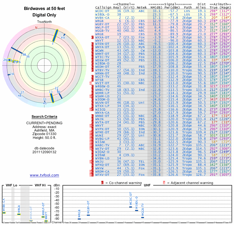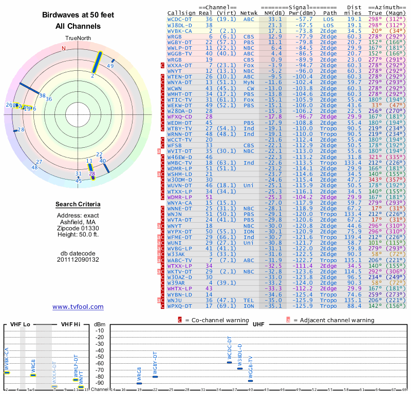 Here are the results for your location. The transmitter database was last updated on June 7, 2013. For more information about these plots and how to interpret them, please check out the Signal Analysis FAQ.