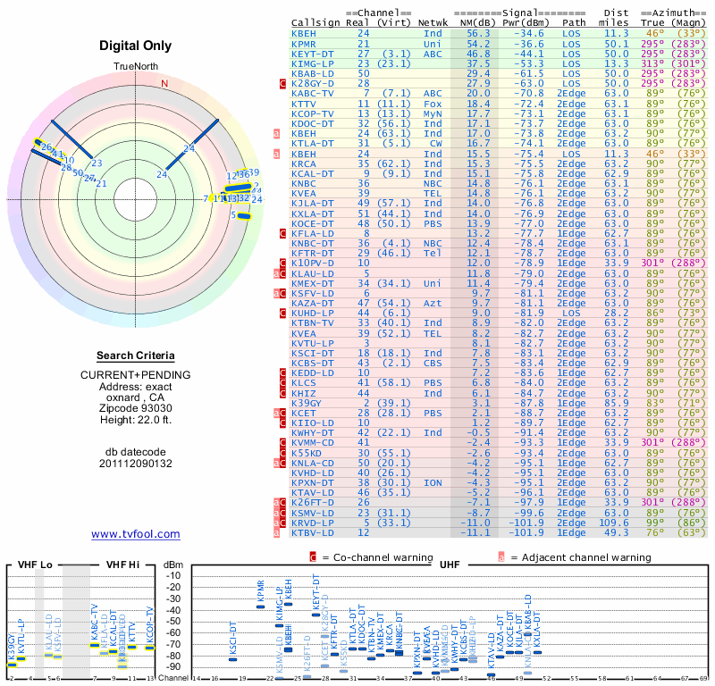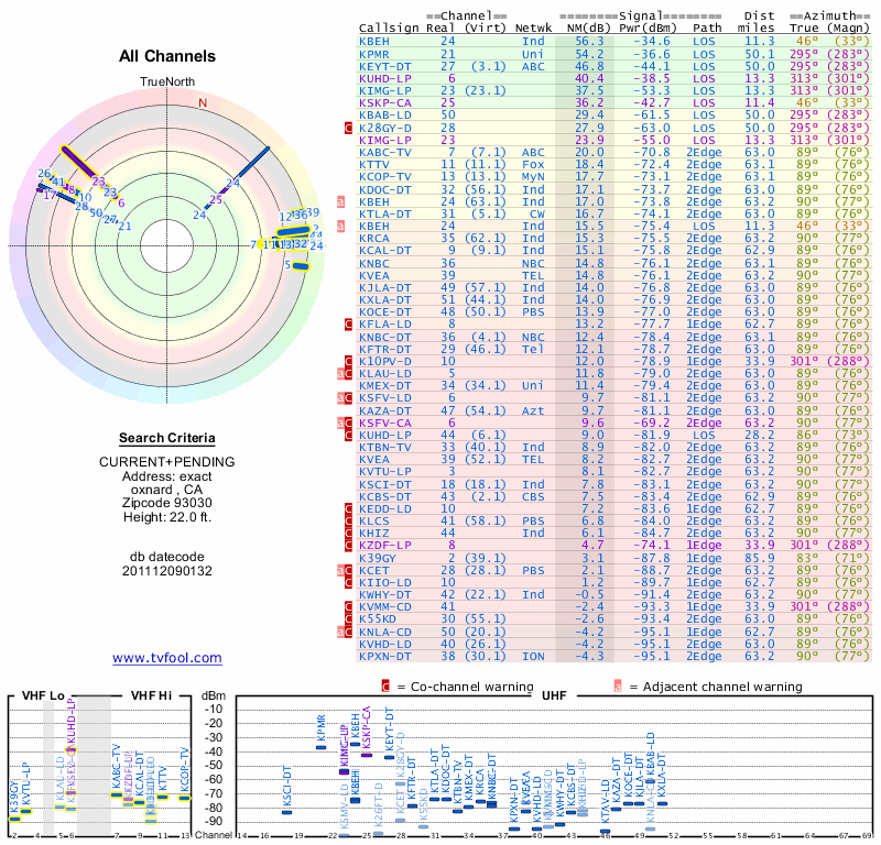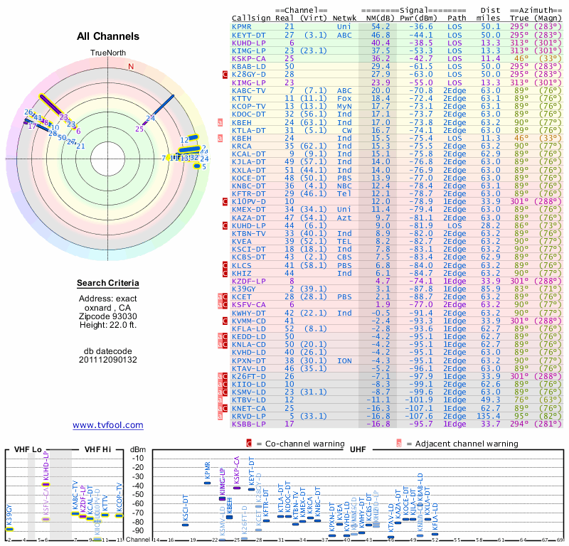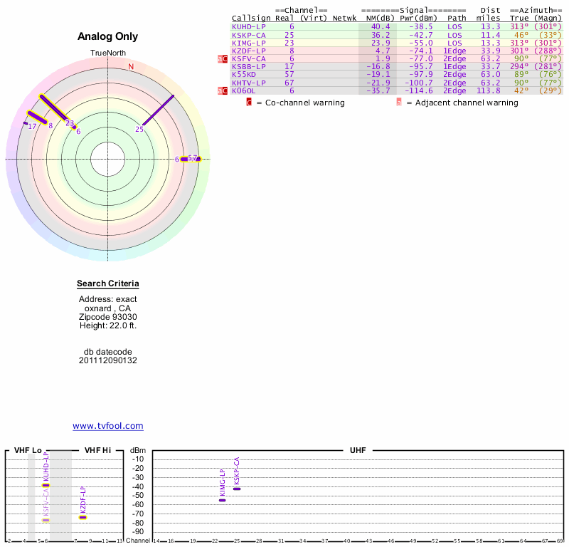 Here are the results for your location. The transmitter database was last updated on June 7, 2013. For more information about these plots and how to interpret them, please check out the Signal Analysis FAQ.