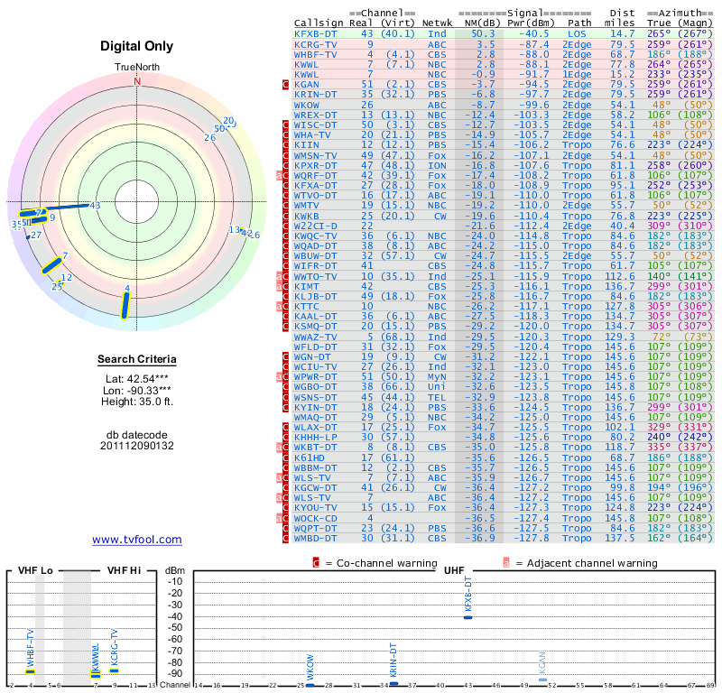 Here are the results for your location. The transmitter database was last updated on June 7, 2013. For more information about these plots and how to interpret them, please check out the Signal Analysis FAQ.