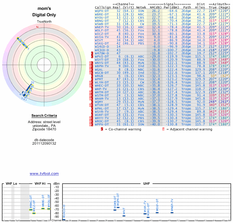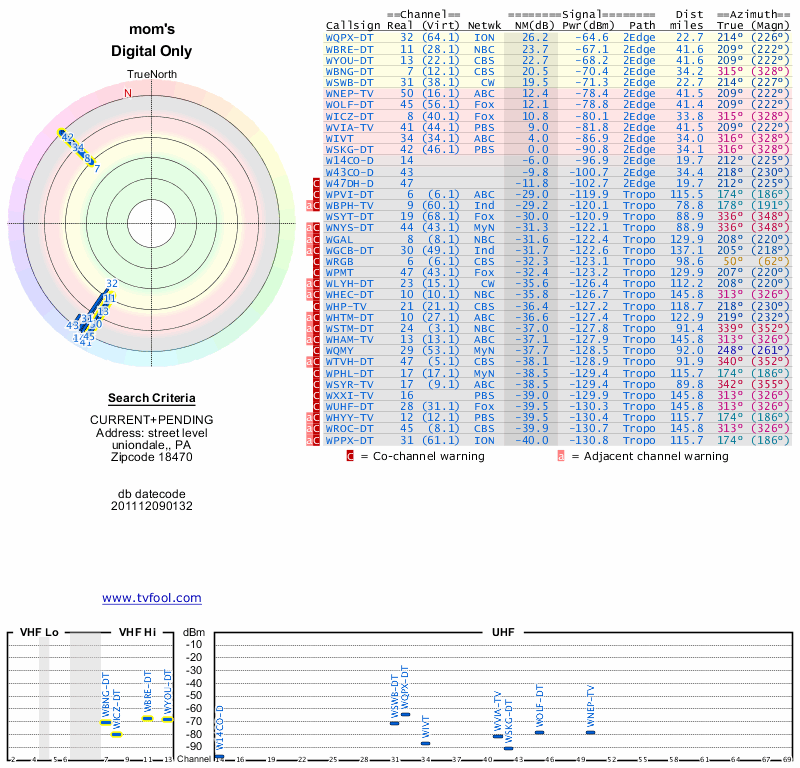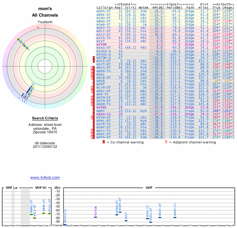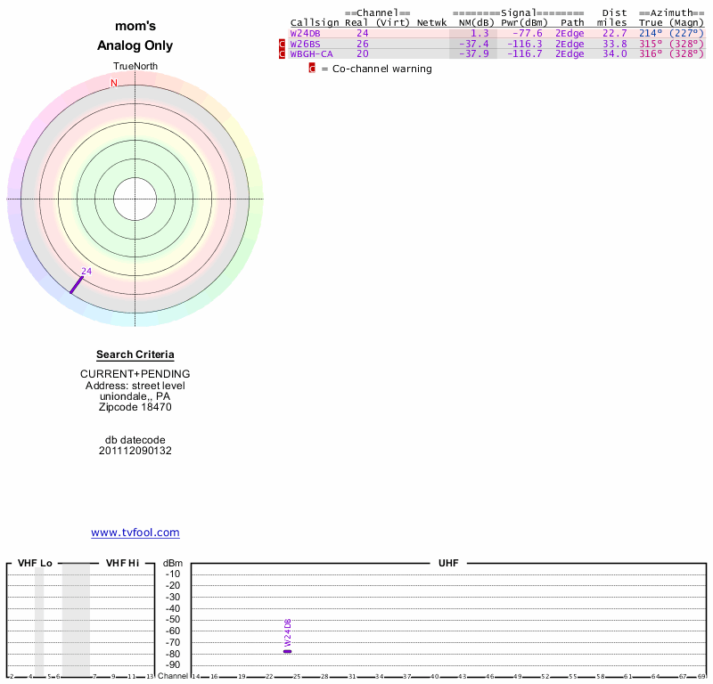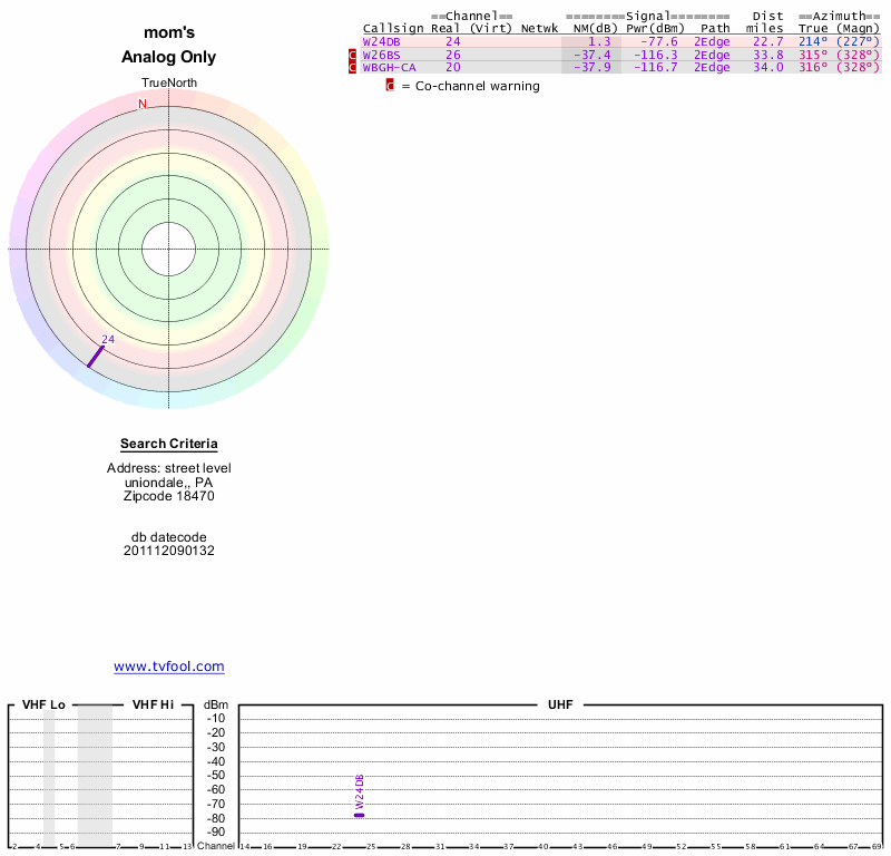 Here are the results for your location. The transmitter database was last updated on June 7, 2013. For more information about these plots and how to interpret them, please check out the Signal Analysis FAQ.