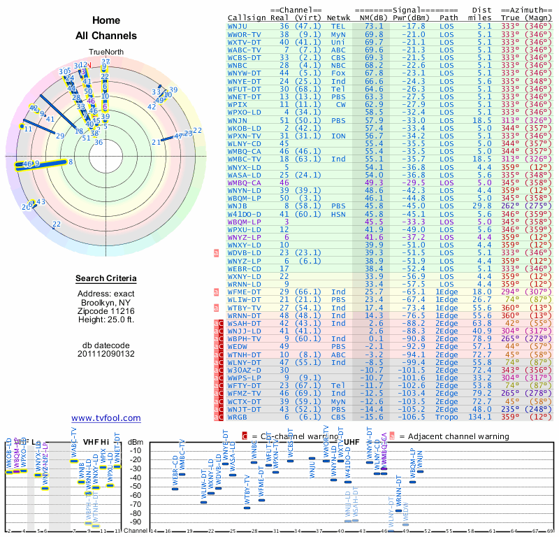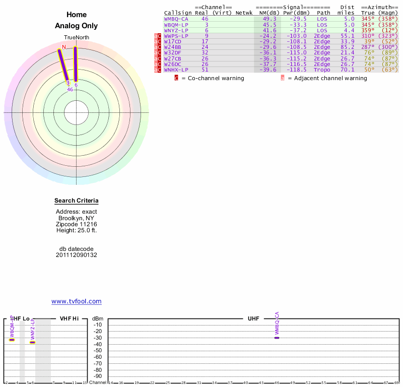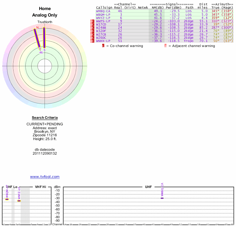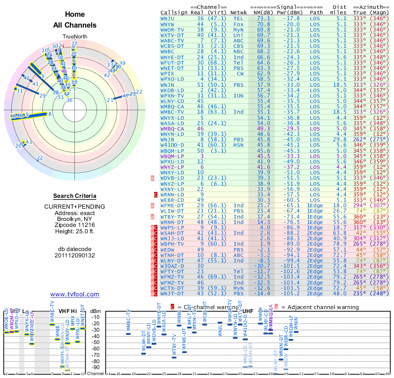 Here are the results for your location. The transmitter database was last updated on June 7, 2013. For more information about these plots and how to interpret them, please check out the Signal Analysis FAQ.