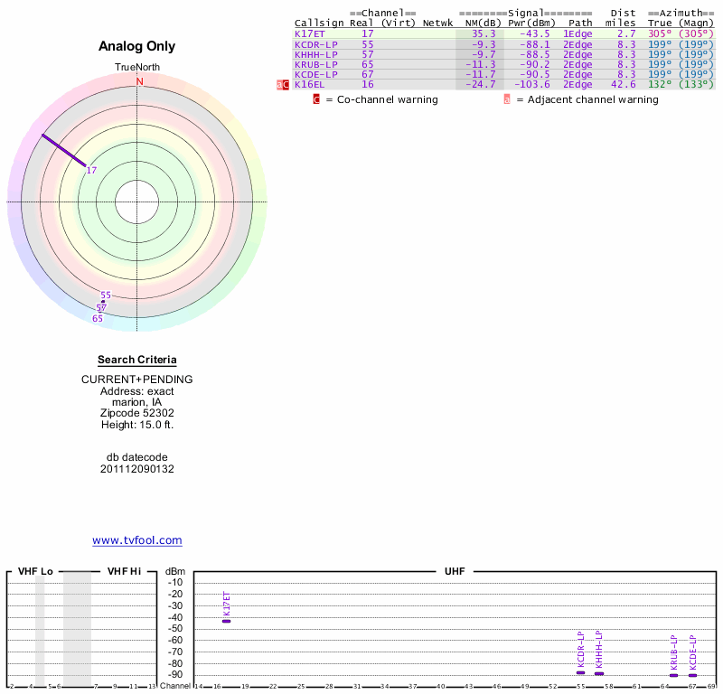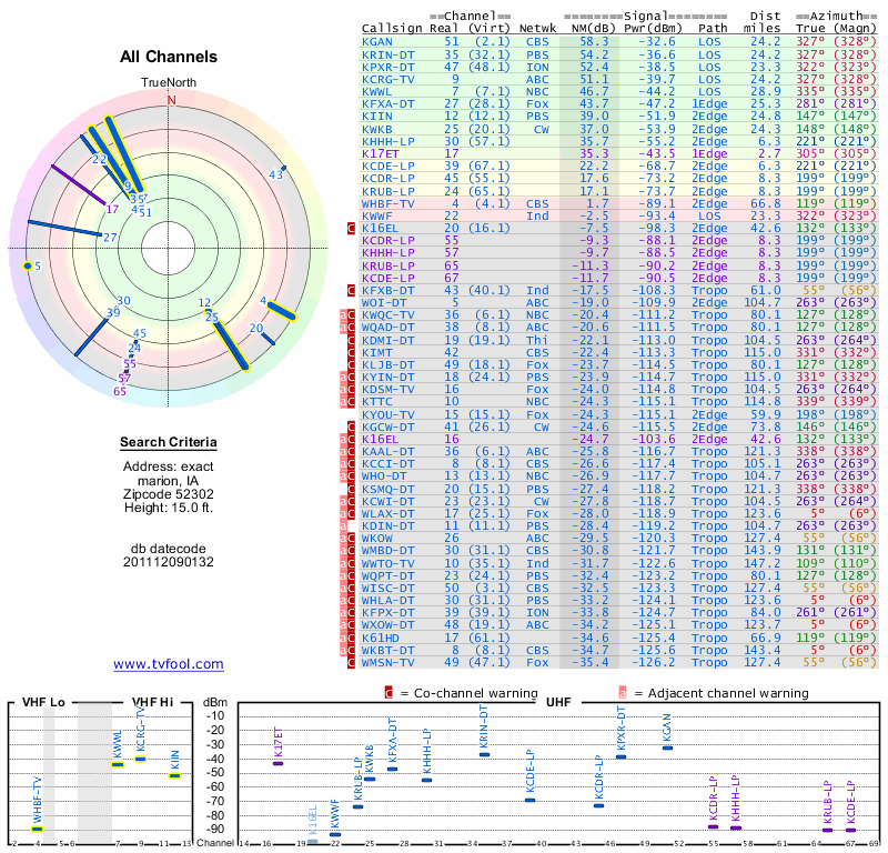 Here are the results for your location. The transmitter database was last updated on June 7, 2013. For more information about these plots and how to interpret them, please check out the Signal Analysis FAQ.