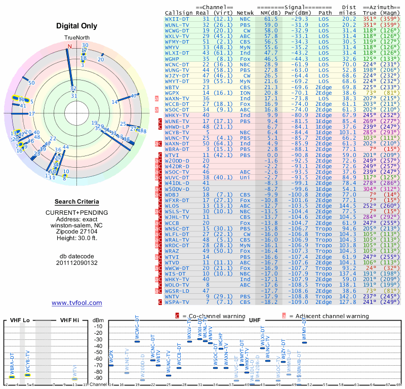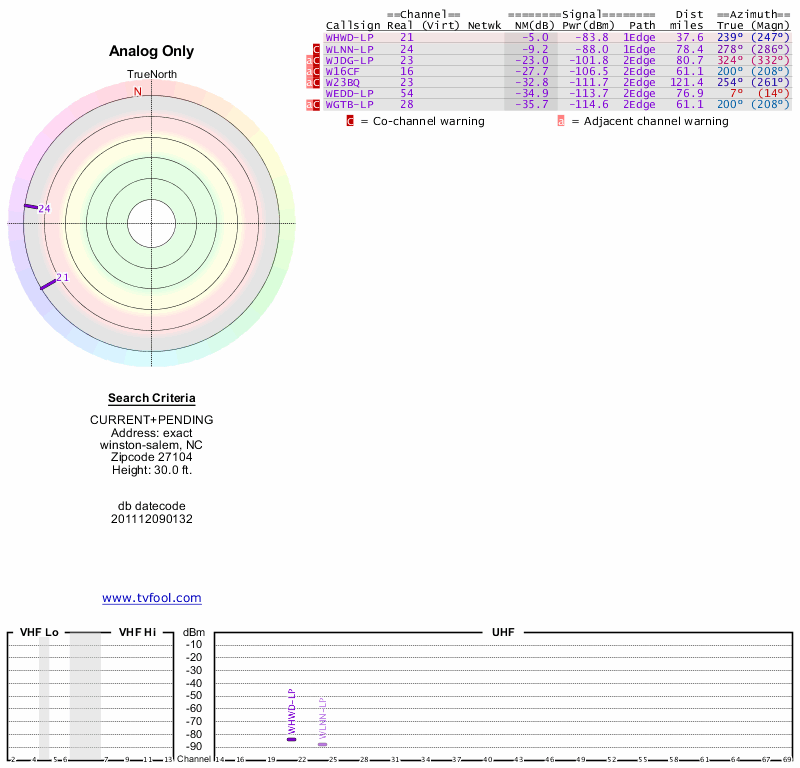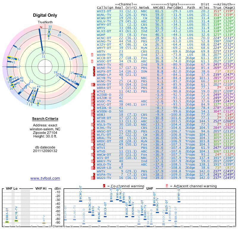 Here are the results for your location. The transmitter database was last updated on June 7, 2013. For more information about these plots and how to interpret them, please check out the Signal Analysis FAQ.