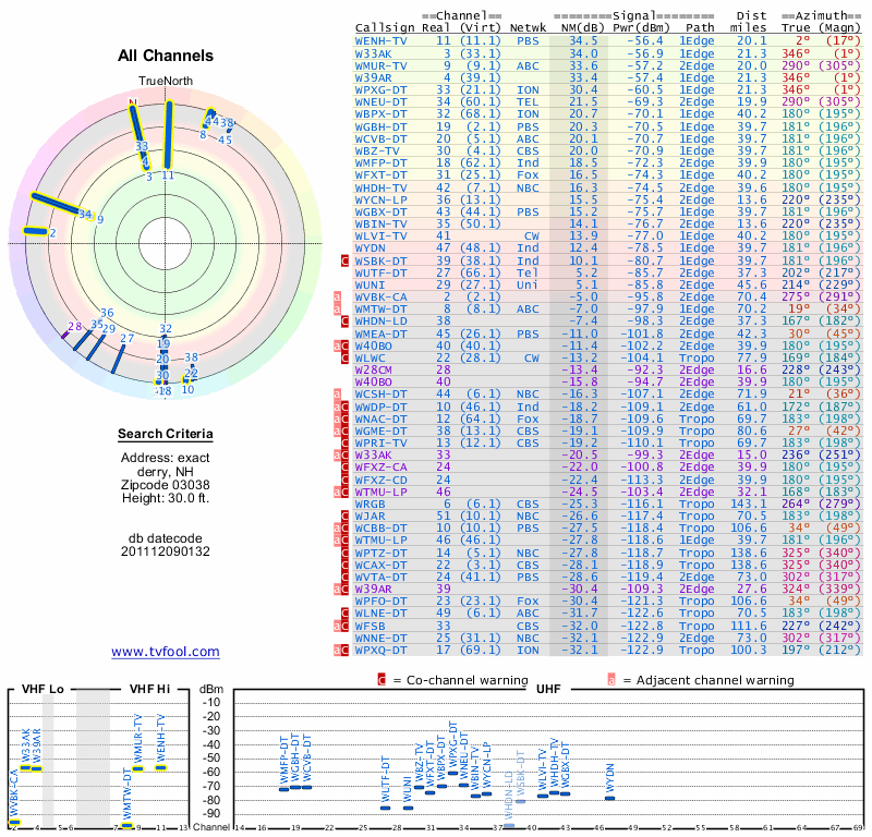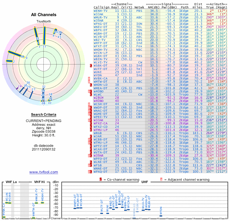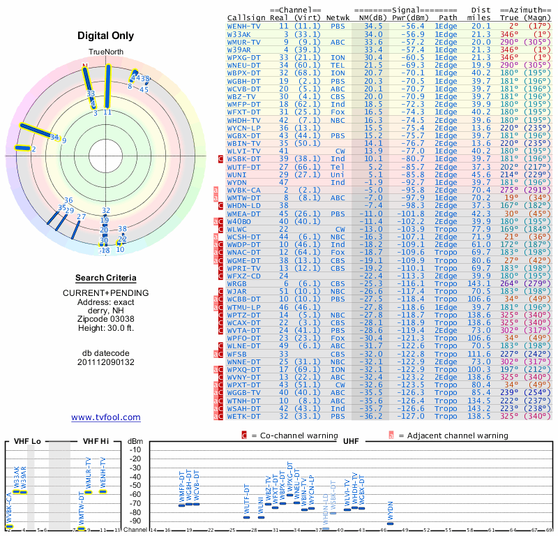 Here are the results for your location. The transmitter database was last updated on June 7, 2013. For more information about these plots and how to interpret them, please check out the Signal Analysis FAQ.